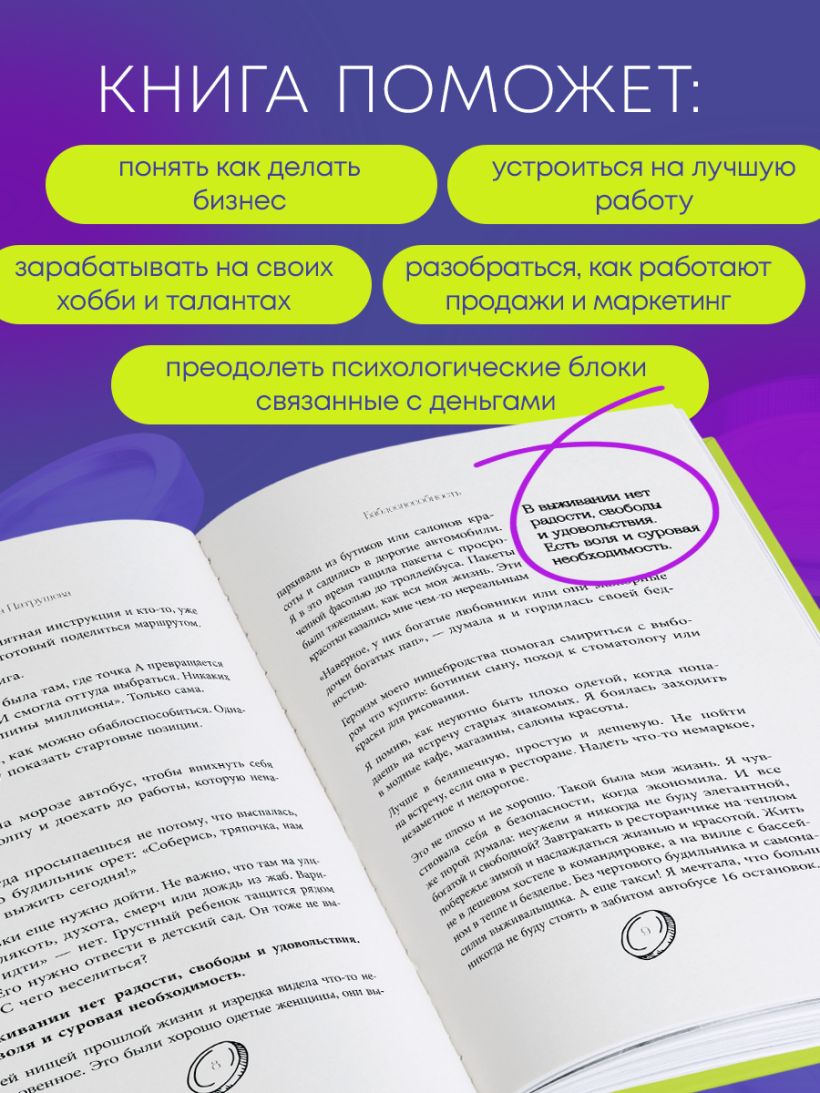 В книге много упражнений для увеличения своей Баблоемкости. Они помогут построить дружеские отношения с деньгами. А еще внутри есть реальные примеры простых и быстрых способов заработать — в найме, на хобби, в своем деле.