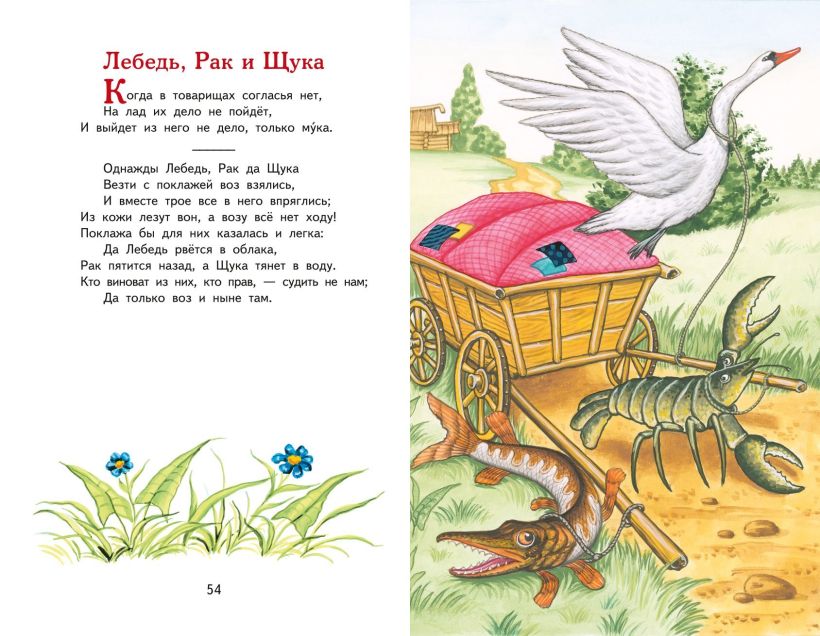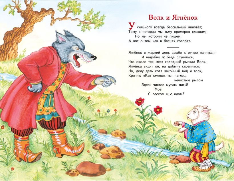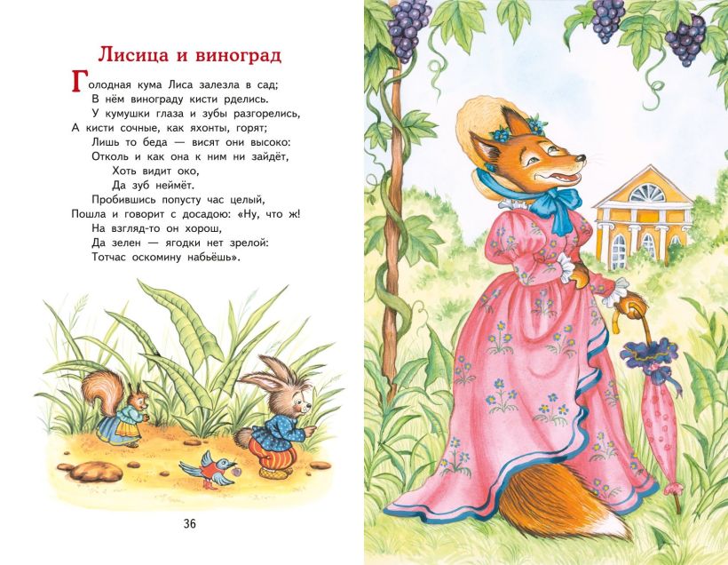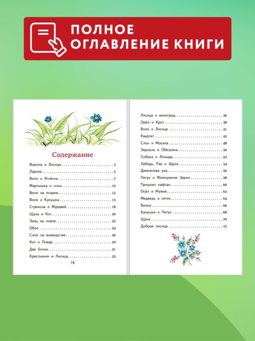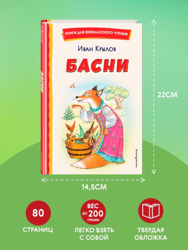 В сборник вошло более 30 известных басен И. А. Крылова, в том числе обязательные для изучения по школьной программе: «Ворона и Лисица», «Волк и Ягнёнок», «Стрекоза и Муравей», «Кот и Повар», «Слон и Моська», «Квартет».