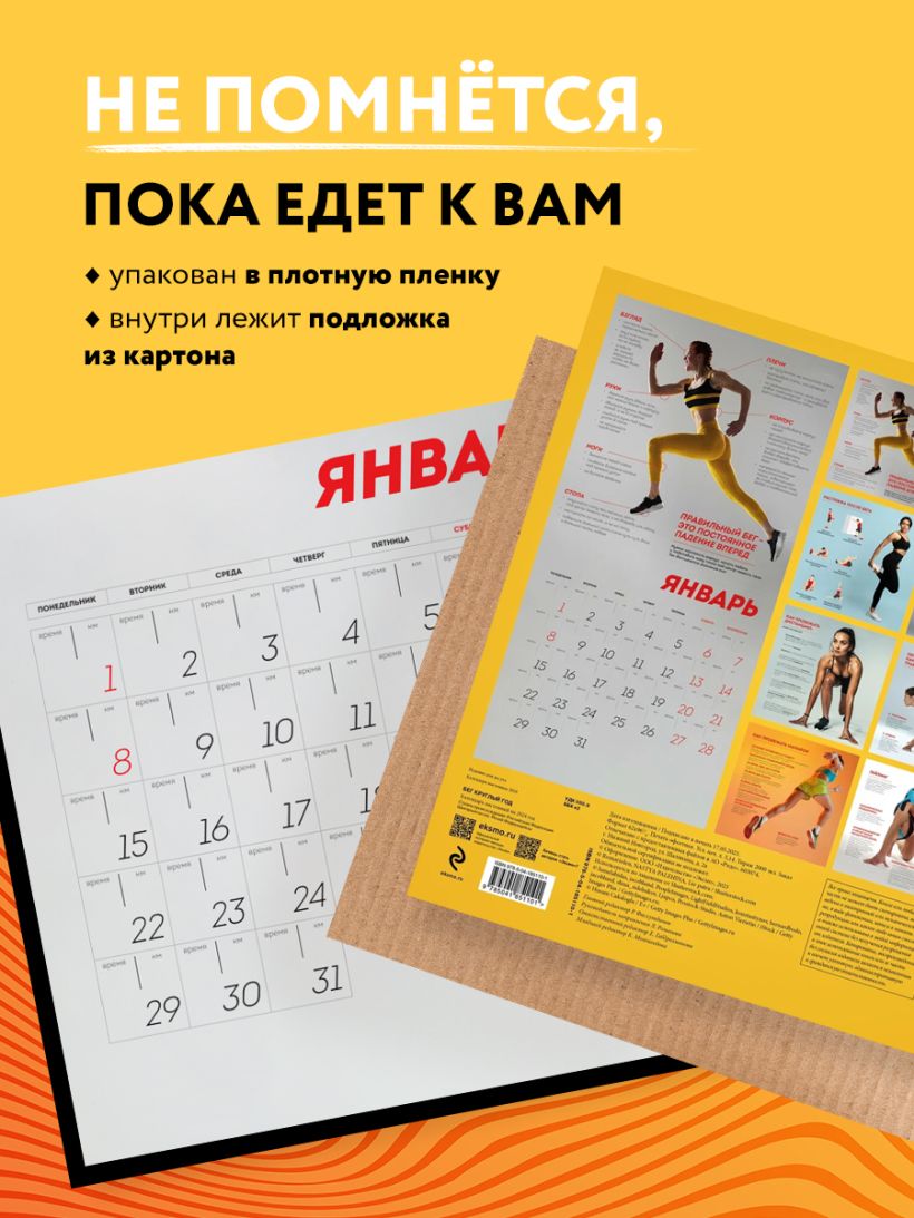 Календарь для тех, кто бегает или только собирается. На каждом развороте познавательная инфографика о беге. В сетке — место для записи километров и продолжительности бега.
