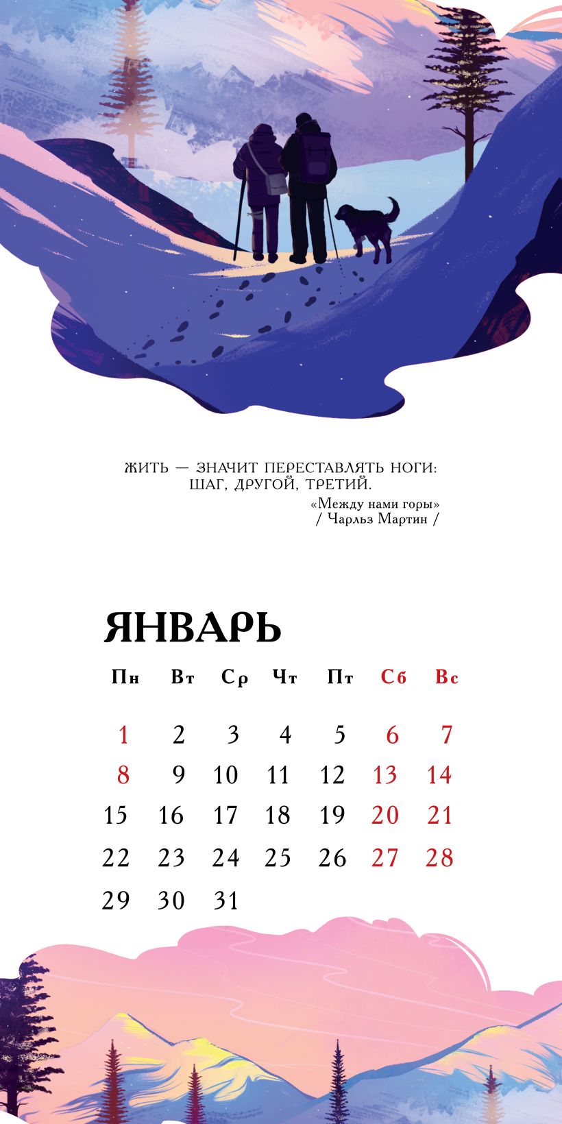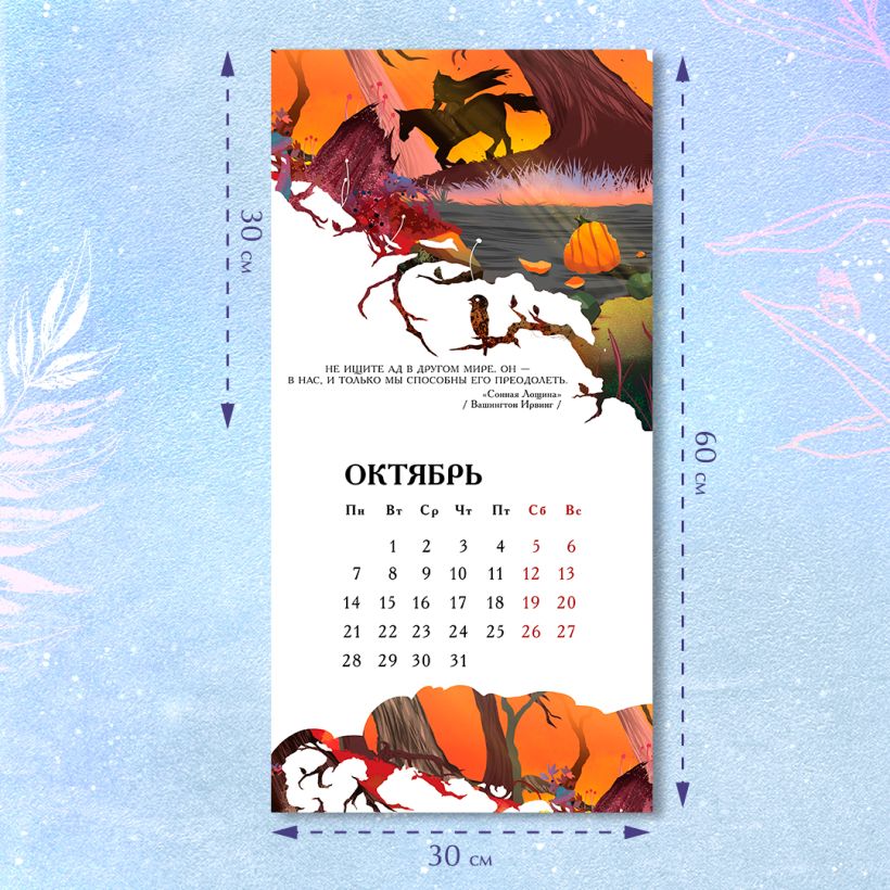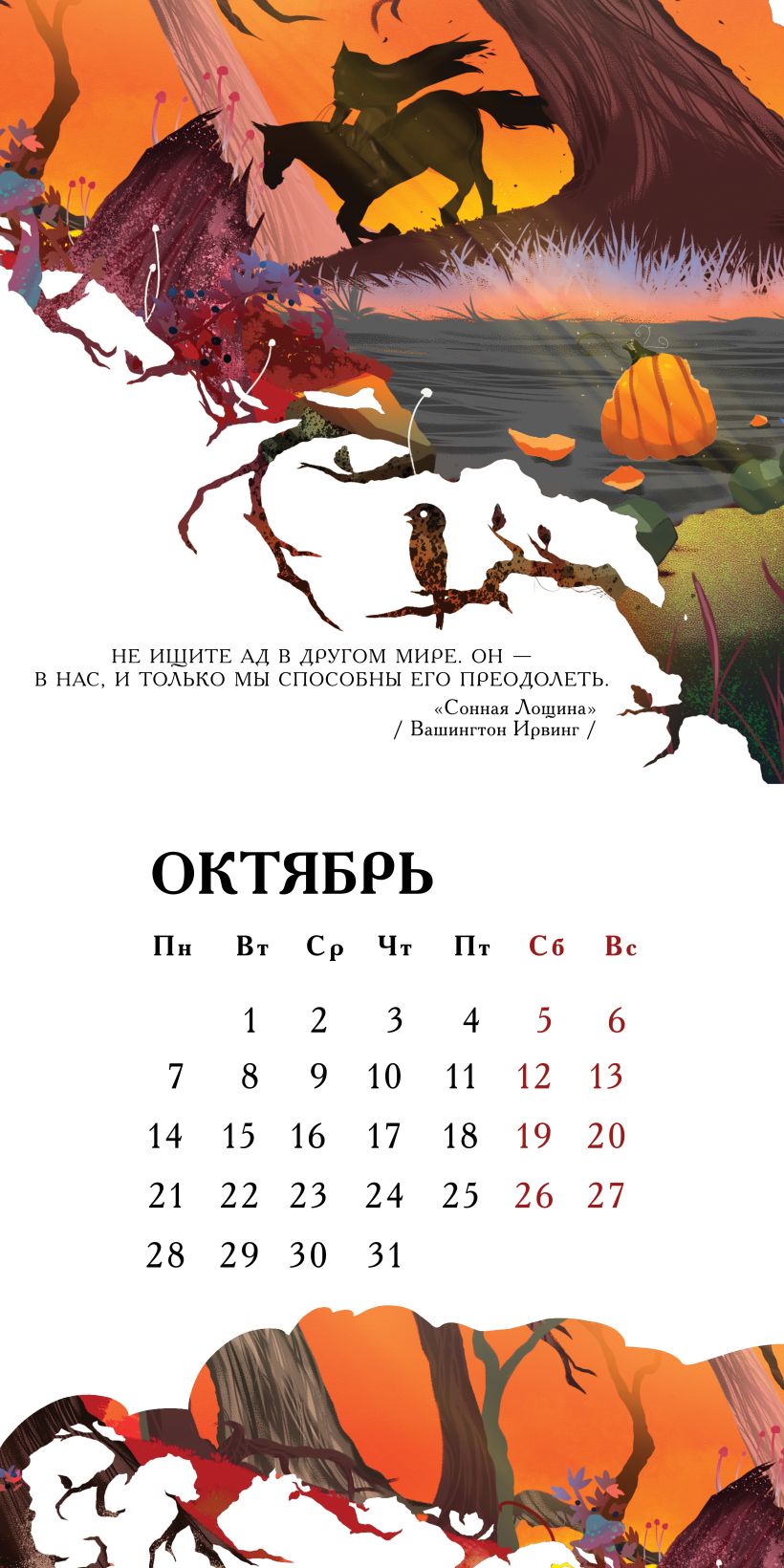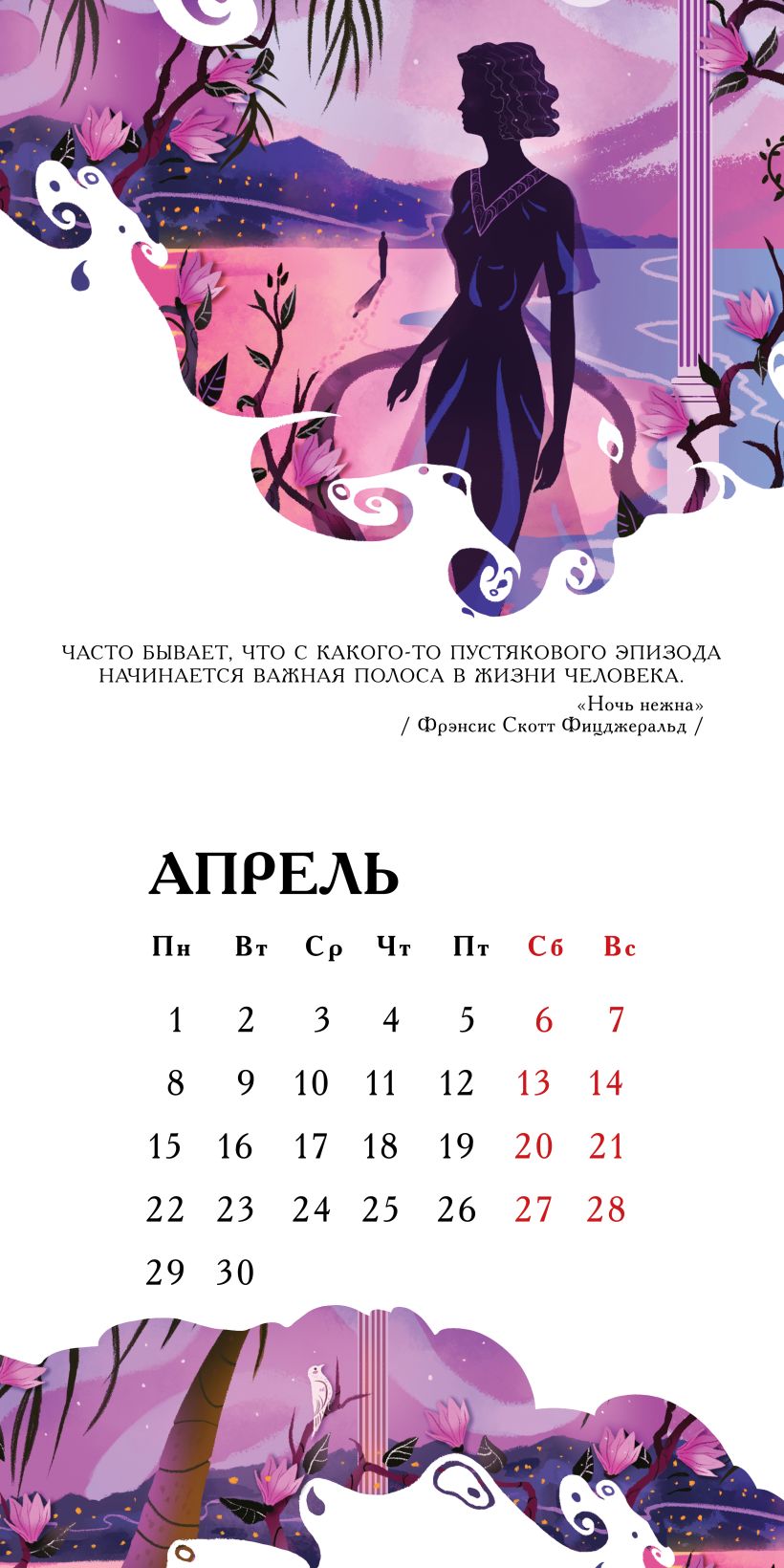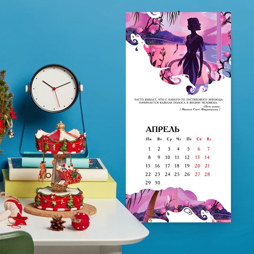 Календарь создан по вдохновению книжной серией «Белая птица», которая переосмысляет подачу классических произведений. Яркие и чувственные иллюстрации вдохновлены известными современными и классическими романами: «Грозовой перевал», «Сонная лощина», «Она же Грейс», «Я — посланник» и другими. На каждый месяц подобрана цитата, передающая дух книги.