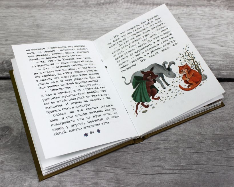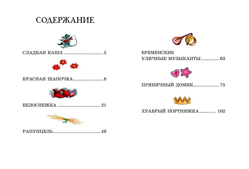 В книгу вошло 7 сказок: «Сладкая каша», «Красная Шапочка», «Белоснежка», «Рапунцель», «Бременские музыканты», «Пряничный домик» и «Храбрый портняжка».