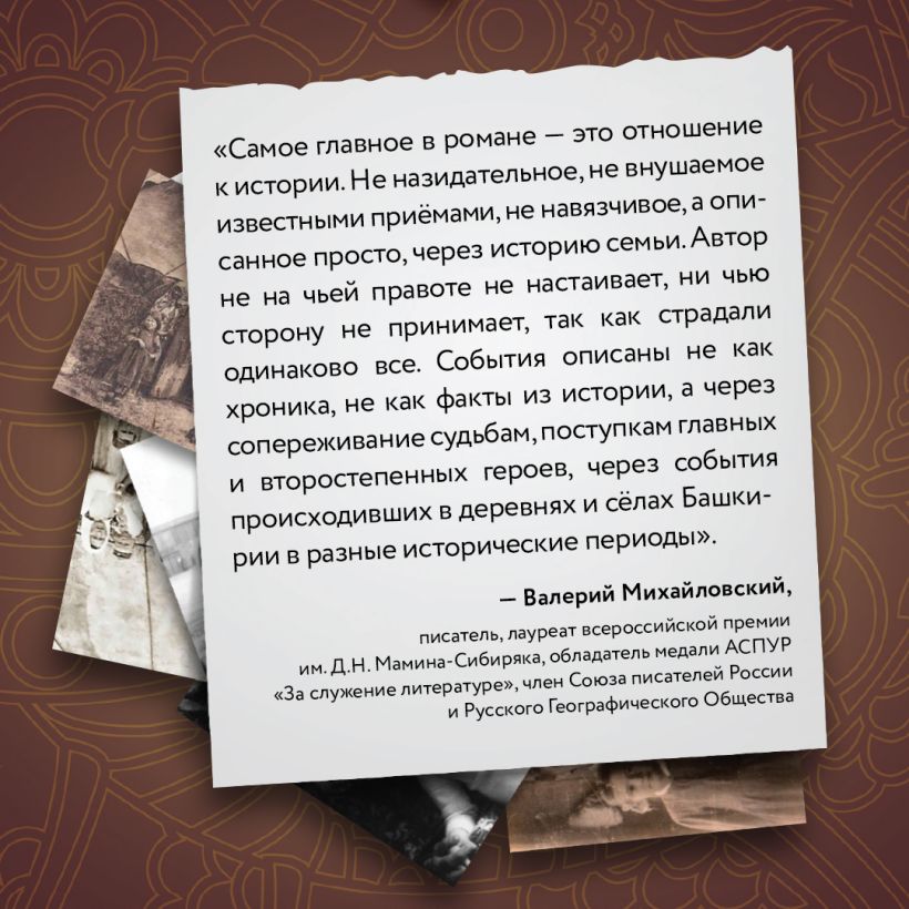 Мне понравилось, что писатель использует в романе и фольклорные элементы, тексты башкирских песен, легенды, что придает книге особый колорит. (И это неспроста: Рамазан Шайхулов родился и вырос в Башкортостане!)