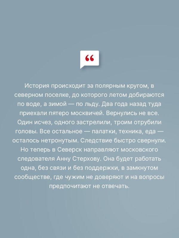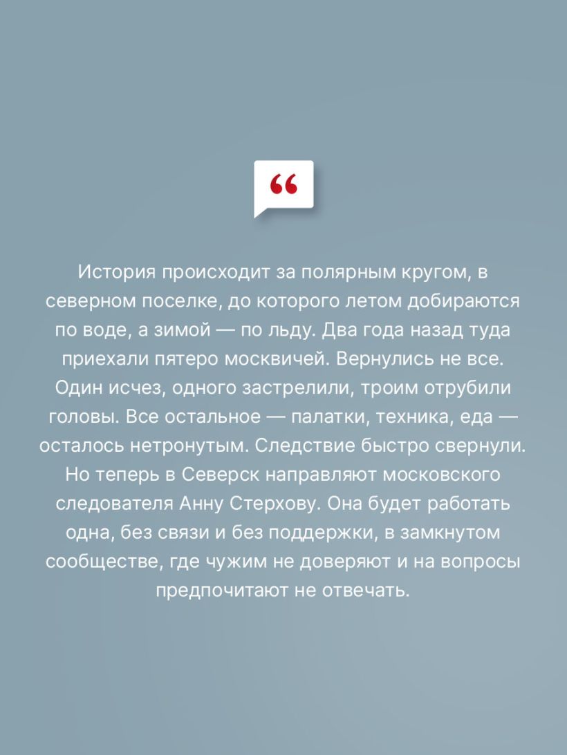 Анна Стерхова прилетела в командировку в северный поселок золотодобытчиков, чтобы расследовать убийство в тайге охотников-любителей из Москвы. Преступление совершено два года назад, но подвижек в деле нет. Рассматривалась версия, что четверых убил пятый член компании, их приятель Холофидин, но он бесследно исчез…