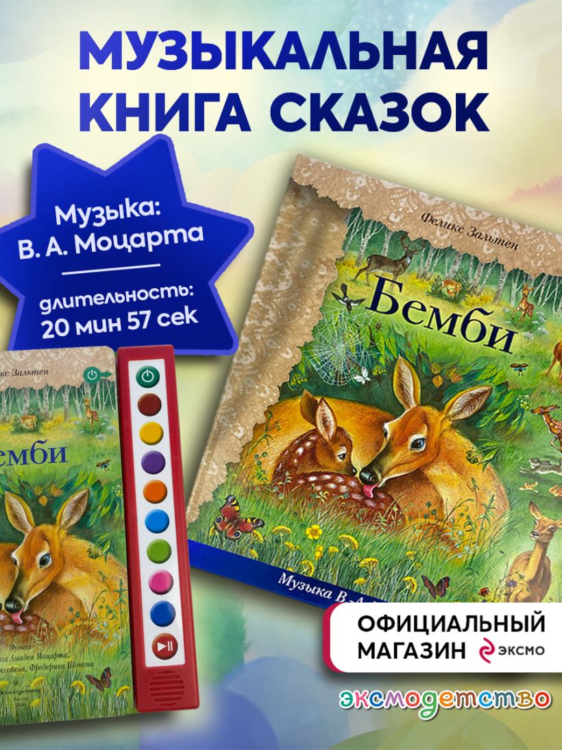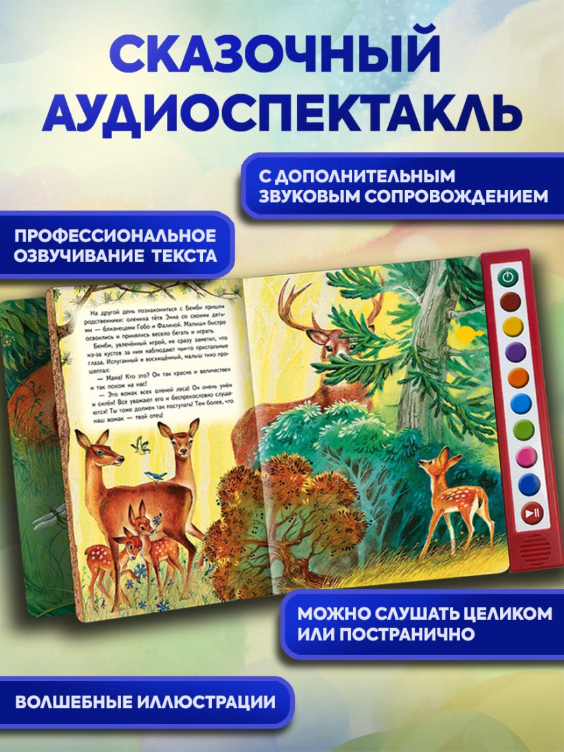 Музыкальная книга-плеер — это прекрасное сочетание традиционной книги и современных технологий. Красочное иллюстрированное издание классической сказки дополнено звуковым модулем-плеером. Яркие, крупные кнопки на панели модуля позволяют прослушать сказку как по главам, так и полностью, от начала до конца, а также сделать паузу в прослушивании. Время звучания всей сказки — 25 минут, РЕКОРД СРЕДИ ЗВУКОВЫХ КНИГ. Наша книга — это идеальный вариант «сказки на ночь»: пока ребёнок слушает книгу и засыпает, взрослые могут заняться своими делами. Профессиональное художественное чтение текста сопровождается завершёнными музыкальными композициями — шедеврами мировой классики. Только в наших книгах-плеерах используются дополнительные звуки (шелест листвы, пение птиц и т. п.), создающие эффект присутствия на настоящем спектакле!