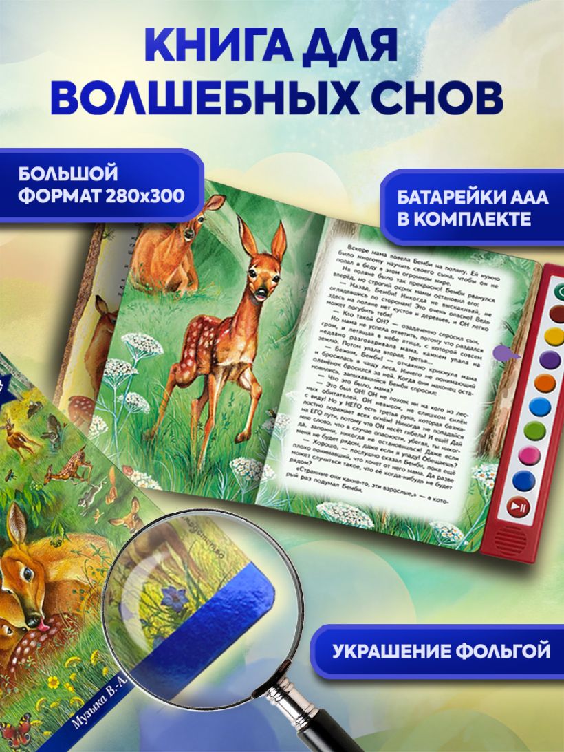 Музыкальная книга-плеер укомплектована двумя энергоёмкими алкалиновыми батарейками типа ААА.