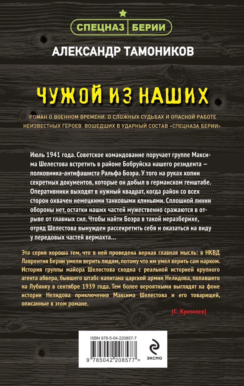 Роман о военном времени, о сложных судьбах и опасной работе неизвестных героев, вошедших в ударный состав «спецназа Берии». 1945 год. Война близится к победному концу. Группа подполковника Максима Шелестова выявляет среди военнопленных морского офицера Бертольда Хофера, имевшего непосредственное отношение к минированию крымского побережья. На допросе немец признается, что после ухода гитлеровцев в Крыму остался отряд диверсантов, готовый в любую минуту совершить подрыв советских объектов. Группа Шелестова выезжает на место, чтобы предотвратить катастрофу. Но в последний момент выясняется, что немецкое командование не доверяло Хоферу и часть проделанной им работы по минированию была отвлекающим маневром. На то, чтобы выяснить точное место и время диверсии, у Максима остаются считаные часы… «Эта серия хороша тем, что в ней проведена верная главная мысль: в НКВД Лаврентия Берии умели верить людям, потому что им умел верить сам нарком. История группы майора Шелестова сходна с реальной историей крупного агента абвера, бывшего штабс-капитана царской армии Нелидова, попавшего на Лубянку в сентябре 1939 года. Тем более вероятными выглядят на фоне истории Нелидова приключения Максима Шелестова и его товарищей, описанные в этом романе». — С. Кремлев Общий тираж книг А. Тамоникова — более 10 миллионов экземпляров.