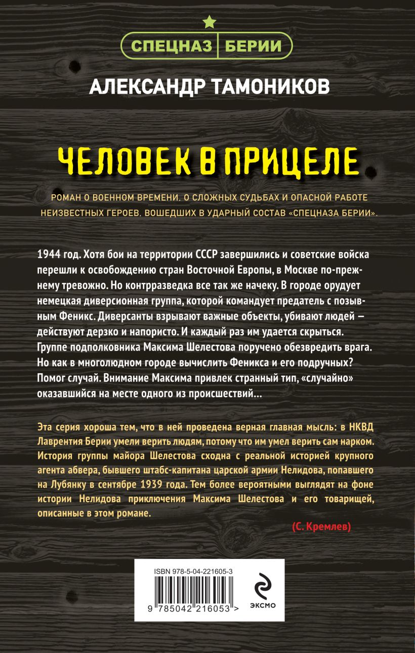 Роман о военном времени, о сложных судьбах и опасной работе неизвестных героев, вошедших в ударный состав «спецназа Берии». 1945 год. Война близится к победному концу. Группа подполковника Максима Шелестова выявляет среди военнопленных морского офицера Бертольда Хофера, имевшего непосредственное отношение к минированию крымского побережья. На допросе немец признается, что после ухода гитлеровцев в Крыму остался отряд диверсантов, готовый в любую минуту совершить подрыв советских объектов. Группа Шелестова выезжает на место, чтобы предотвратить катастрофу. Но в последний момент выясняется, что немецкое командование не доверяло Хоферу и часть проделанной им работы по минированию была отвлекающим маневром. На то, чтобы выяснить точное место и время диверсии, у Максима остаются считаные часы… «Эта серия хороша тем, что в ней проведена верная главная мысль: в НКВД Лаврентия Берии умели верить людям, потому что им умел верить сам нарком. История группы майора Шелестова сходна с реальной историей крупного агента абвера, бывшего штабс-капитана царской армии Нелидова, попавшего на Лубянку в сентябре 1939 года. Тем более вероятными выглядят на фоне истории Нелидова приключения Максима Шелестова и его товарищей, описанные в этом романе». — С. Кремлев Общий тираж книг А. Тамоникова — более 10 миллионов экземпляров.