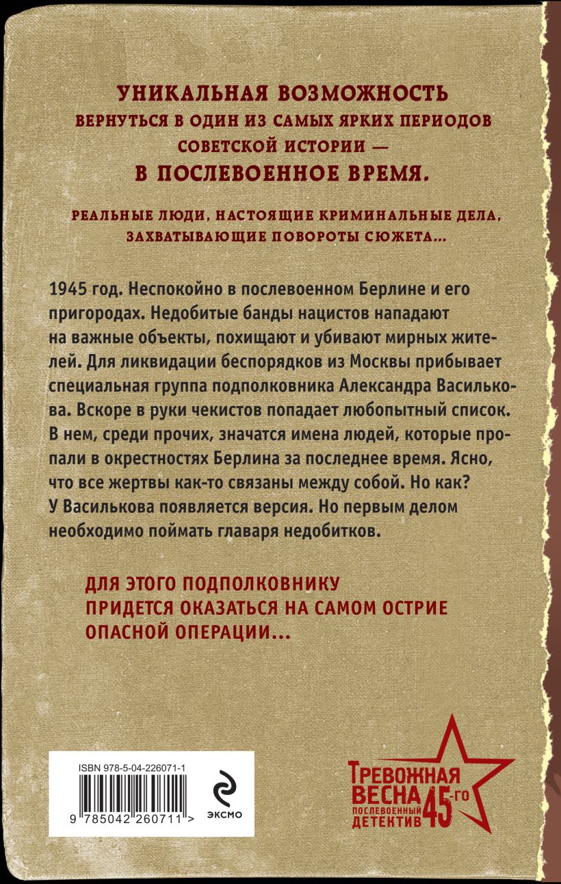 1945 год. Неспокойно в послевоенном Берлине и его пригородах. Недобитые банды нацистов нападают на важные объекты, похищают и убивают мирных жителей. Для ликвидации беспорядков из Москвы прибывает специальная группа подполковника Александра Василькова. Вскоре в руки чекистов попадает любопытный список. В нем, среди прочих, значатся имена людей, которые пропали в окрестностях Берлина за последнее время. Ясно, что все жертвы как-то связаны между собой. Но как? У Василькова появляется версия. Но первым делом необходимо поймать главаря недобитков. Для этого подполковнику придется оказаться на самом острие опасной операции…