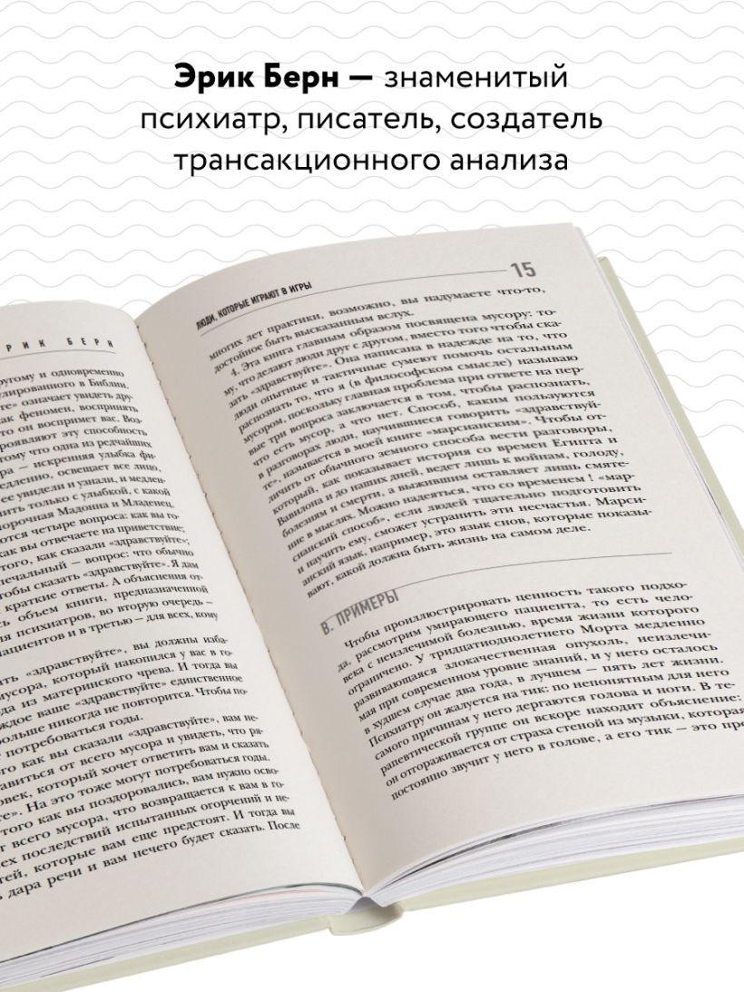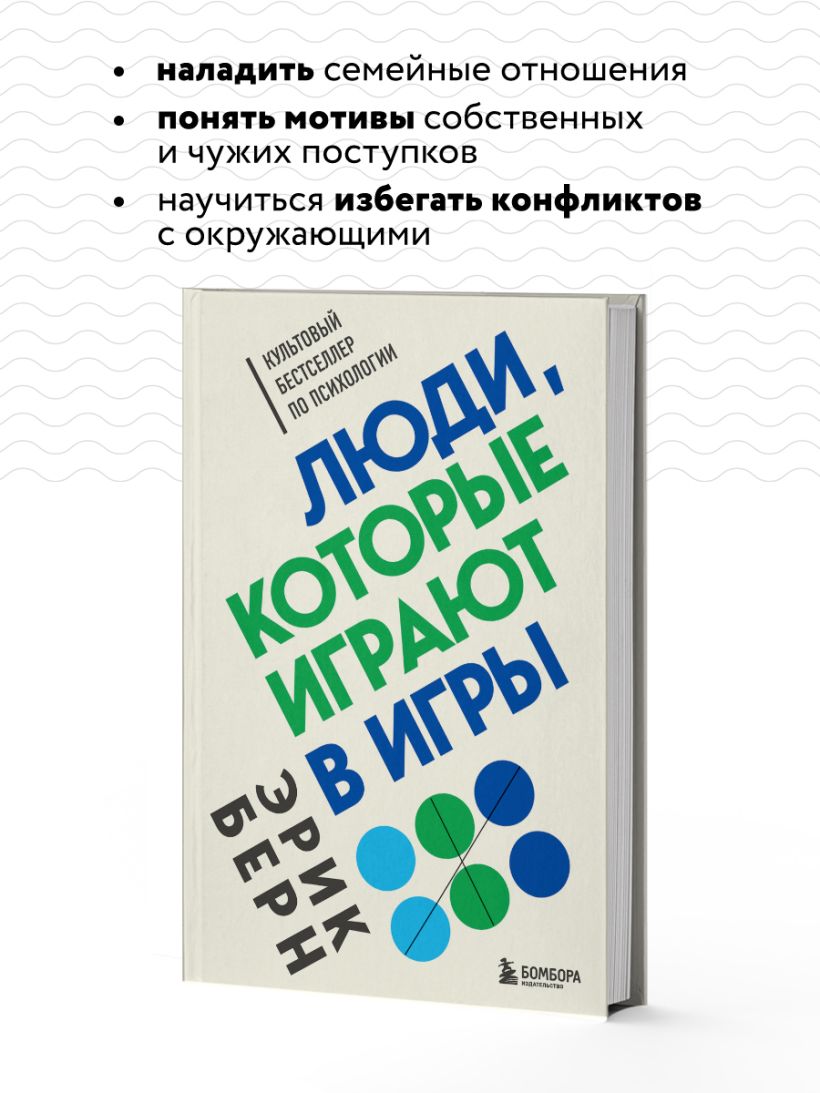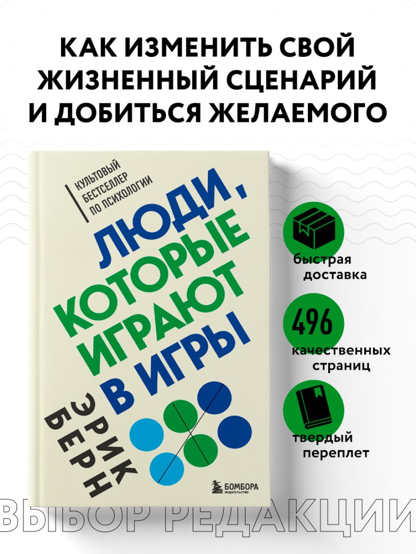 Перед вами одна из культовых книг по психологии человеческих взаимоотношений. Эрик Берн разработал систему, способную избавить человека от влияния жизненных сценариев, программирующих его поведение, научить его меньше играть в отношениях с собой и другими, обрести подлинную свободу и побудить к личностному росту. В этой книге вы найдете много полезных советов, которые помогут понять природу человеческого общения, мотивы собственных и чужих поступков и причины возникновения конфликтов. По мнению автора, судьба каждого из нас во многом определяется еще в раннем детстве, однако в зрелом возрасте можно научиться управлять ею, если этого захотеть. Именно с публикации этого международного бестселлера после падения железного занавеса в нашей стране начался психологический бум, когда миллионы людей осознали, что с помощью психологии можно многое понять в себе и окружающих. Эрик Леннард Берн (1910—1970) — одна из ключевых фигур в современной психологии, создатель оригинального направления в психотерапии — «транзактного анализа», рассматривающего игру в качестве основы человеческих взаимоотношений. Разработка этой теории принесла ученому мировую известность. 48 лет является абсолютным бестселлером по человеческим взаимоотношениям. Входит в мировой ТОП-5 самых популярных книг по психологии. Прямо сейчас эту книгу читают 739 ЧЕЛОВЕК. Эта книга поможет вам: - Наладить семейные отношения. - Понять мотивы собственных и чужих поступков. - Научиться избегать конфликтов с окружающими. В книге вы найдете: - Сценарии игр, в которые люди бессознательно играют каждый день. - Соответствие игр жизненным ситуациям, в которых они разыгрываются. - Стратегии антиигр, с помощью которых можно освободиться от привычного поведения. «Любой человек имеет черты маленького ребенка». — Эрик Берн