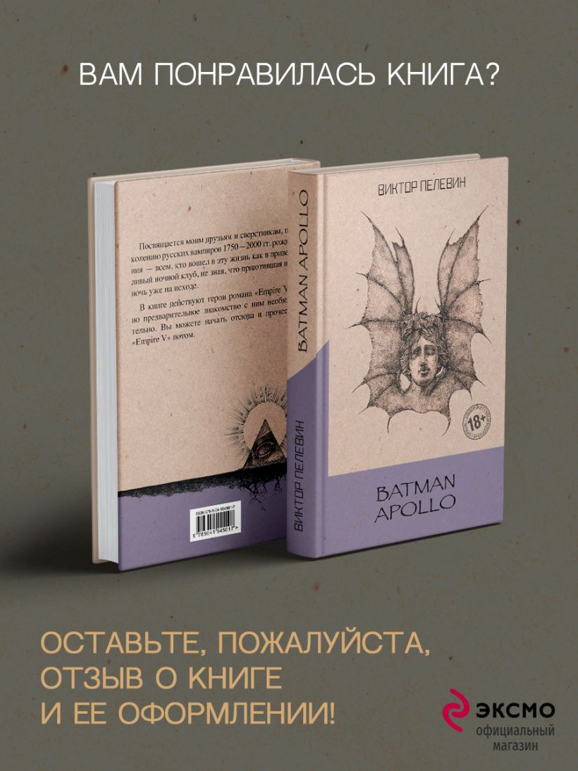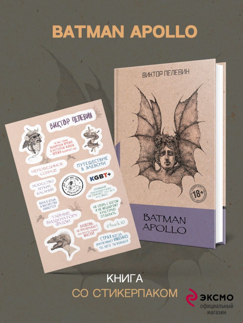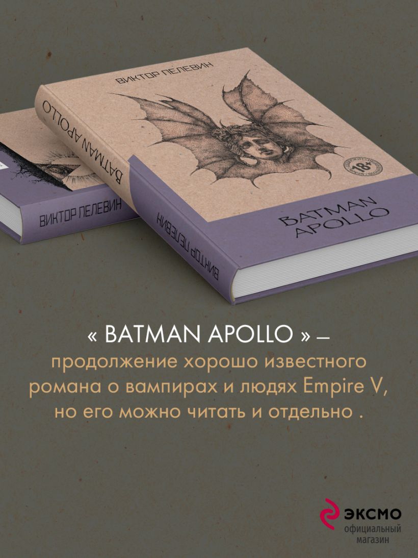 Batman Apollo — продолжение хорошо известного романа о вампирах и людях Empire V, но его можно читать и отдельно. Ничего нового в тексте по сравнению с другими изданиями вы не найдете, но вот обложка у этой книги — лимитированная и специально нарисована художником Алексеем Клепневым. Тонкая абсурдистская графика Клепнева совпадает по настроению с произведениями Пелевина, а ее ироничность не дает этим книгам покрыться лоском скучной классики.