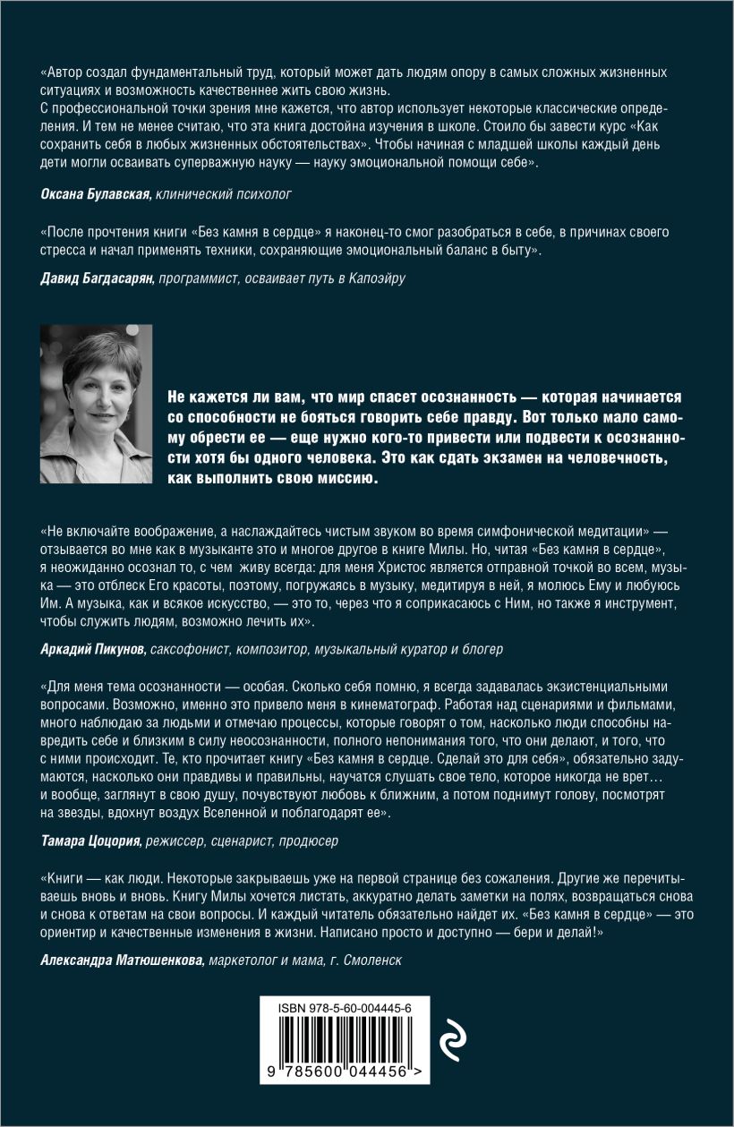 «Книги — как люди. Некоторые закрываешь уже на первой странице без сожаления. Другие же перечитываешь вновь и вновь. Книгу Милы хочется листать, аккуратно делать заметки на полях, возвращаться снова и снова к ответам на свои вопросы. И каждый читатель обязательно найдет их. "Без камня в сердце" — это ориентир и качественные изменения в жизни. Написано просто и доступно — бери и делай!» — Александра, маркетолог и мама, г. Смоленск
