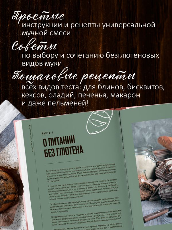 А также вы научитесь готовить все виды теста, от блинного до бисквитного, на основе безглютеновой муки. И выпекать кексы, оладьи, торты, печенья, готовить макароны и пельмени.
