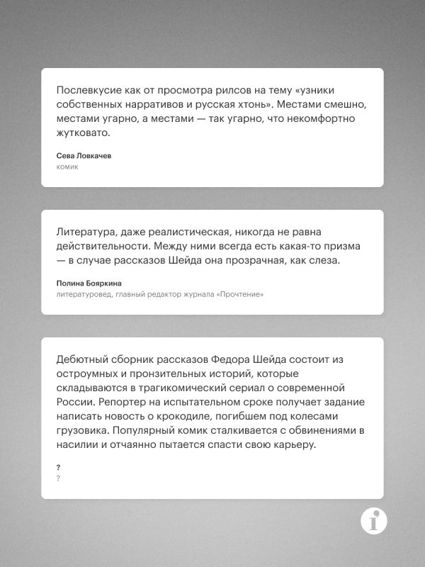 Дебютный сборник рассказов Федора Шейда состоит из остроумных и пронзительных историй, которые складываются в трагикомический сериал о современной России. Репортер на испытательном сроке получает задание написать новость о крокодиле, погибшем под колесами грузовика. Популярный комик сталкивается с обвинениями в насилии и отчаянно пытается спасти свою карьеру. Замкнутый парень везет сумасшедшую соседку в больницу, где случайно знакомится с врачом-гангстером и отправляется в ночное путешествие. Брат и сестра караулят таинственного незнакомца, который по ночам уничтожает советские вывески. Беспощадная сатира и абсурд соседствуют с неожиданной человечностью, горечь сменяется радостью, а привычную повседневность пронизывает сквознячок небытия.