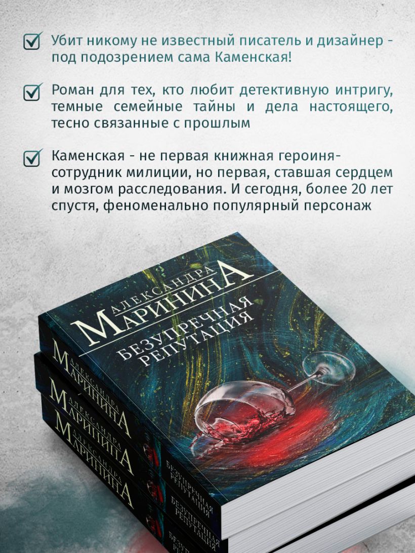 «Многие романы Александры Марининой в России экранизированы, а в Германии переработаны в радиопьесы. Исходя из того, что цель этих обработок — захватывать зрителей и слушателей таким же образом, как захвачены читатели, то фильм и радиопьеса являются не только дополнительными художественными произведениями, но и интересными интерпретациями, которые проникли в тайну успеха Александры Марининой». — Сара Хэги, Кельнский университет, Германия