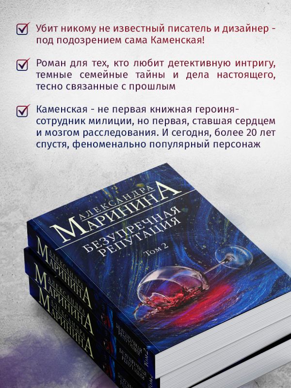 «Маринина не только пишет детективные романы, но и отвечает на вечные вопросы. Автор относится к своим читателям как добрый и опытный учитель к ученикам, которые нуждаются в поддержке, подсказке и направлении на верный путь. Оптимистичная и практичная в своей дидактике, Маринина ставит перед собой вопрос “как жить” и старается помочь читателю найти свой путь к лучшей жизни в сегодняшнем мире. Своими детективами Маринина пишет современный роман “воспитания чувств”: основная цель автора — воспитание посредством развлечения». — Анатолий Вишевский, Гринелльский колледж, США