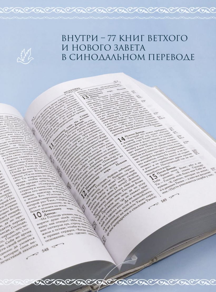 Святой текст Нового Завета Господа Иисуса Христа и книга Псалмов Давида в одном великолепном подарочном переплёте. Печатается по благословению Святейшего Патриарха Московского и Всея Руси Кирилла по изданию Московской Патриархии 2011 г.