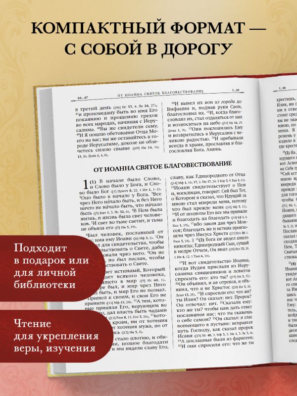 Все книги Нового Завета в русском синодальном переводе в одном томе: канонические Евангелия, книга Деяний святых апостолов, Соборные послания, Послания Павла и Откровение святого апостола Иоанна Богослова. Для комфортного чтения в издании содержатся дополнительные материалы: указатель евангельских и апостольских чтений церковных; последовательность евангельских событий по четырем евангелистам и по книге деяний святых апостолов; денежные единицы в Новом Завете.