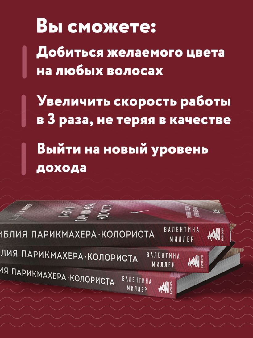 НАСТОЛЬНАЯ КНИГА ДЛЯ МАСТЕРОВ И НОВИЧКОВ ПО ОКРАШИВАНИЮ ВОЛОС. Как, используя минимальное количество красителя, получить объемный сияющий цвет? При помощи цветовой бани! В этой книге автор знакомит читателя с бюджетным и быстрым способом окрашивания волос. Валентина Миллер — ментор парикмахеров, основатель проекта BEAUTY EDUCATION, ведущая видеоблога в YouTube «РасческаТВ», мотиватор. Обучила более 8000 мастеров, от новичков до профессионалов, работала в Европе, Америке, Африке, Австралии, Азии. Автор один за другим раскрывает секреты создания ошеломляющего цвета. Внутри вас ждут лайфхаки и ответы на самые частозадаваемые вопросы, которые помогут избежать ошибок и добиться превосходного результата Из этой книги вы узнаете, как: - окрасить ломкие и сухие волосы, не повреждая их; - нейтрализовать нежелательные оттенки желтого и зеленого цвета; - придать насыщенный цвет пористым и поврежденным волосам.