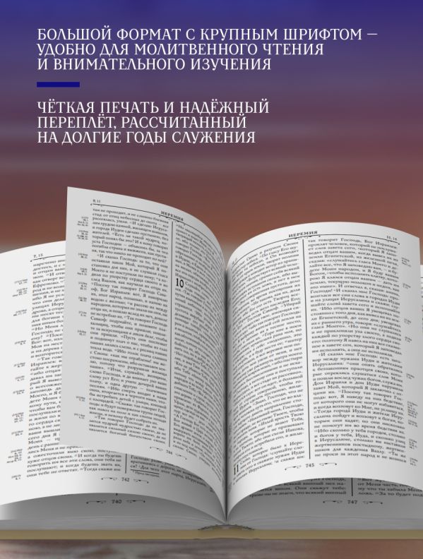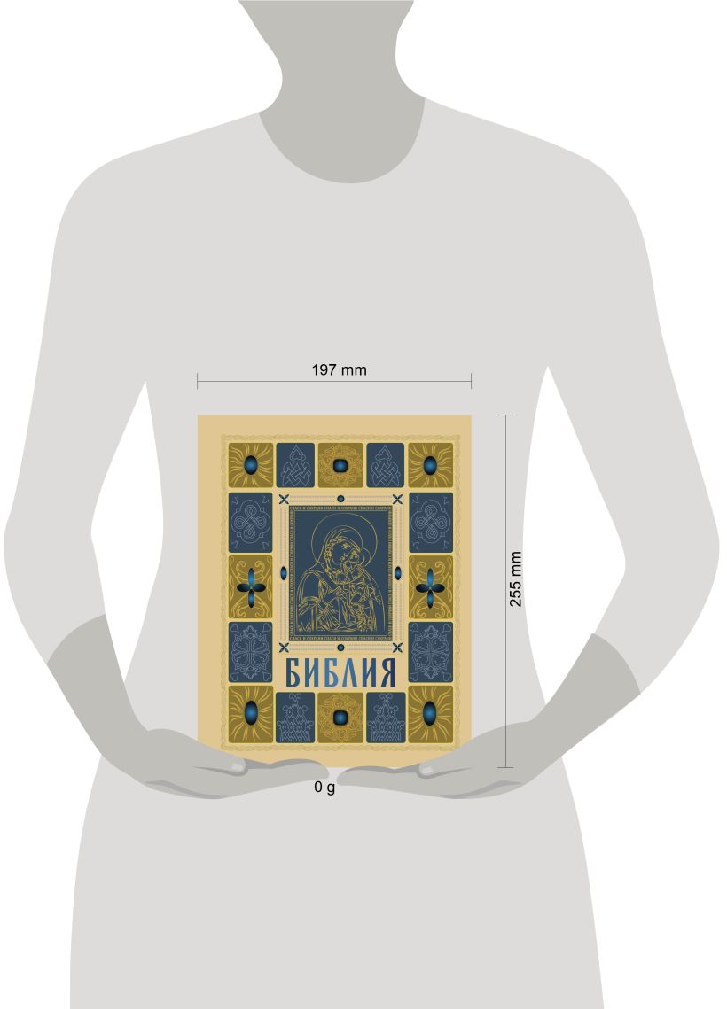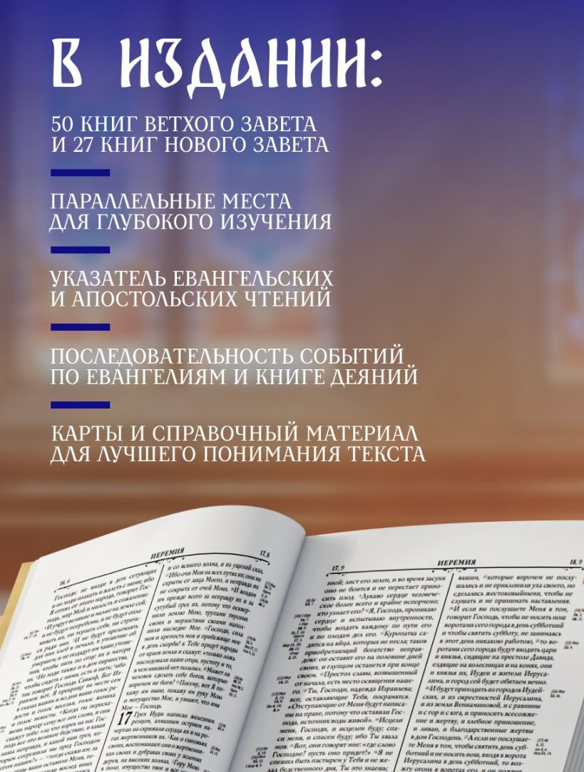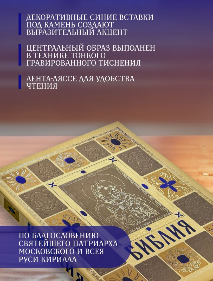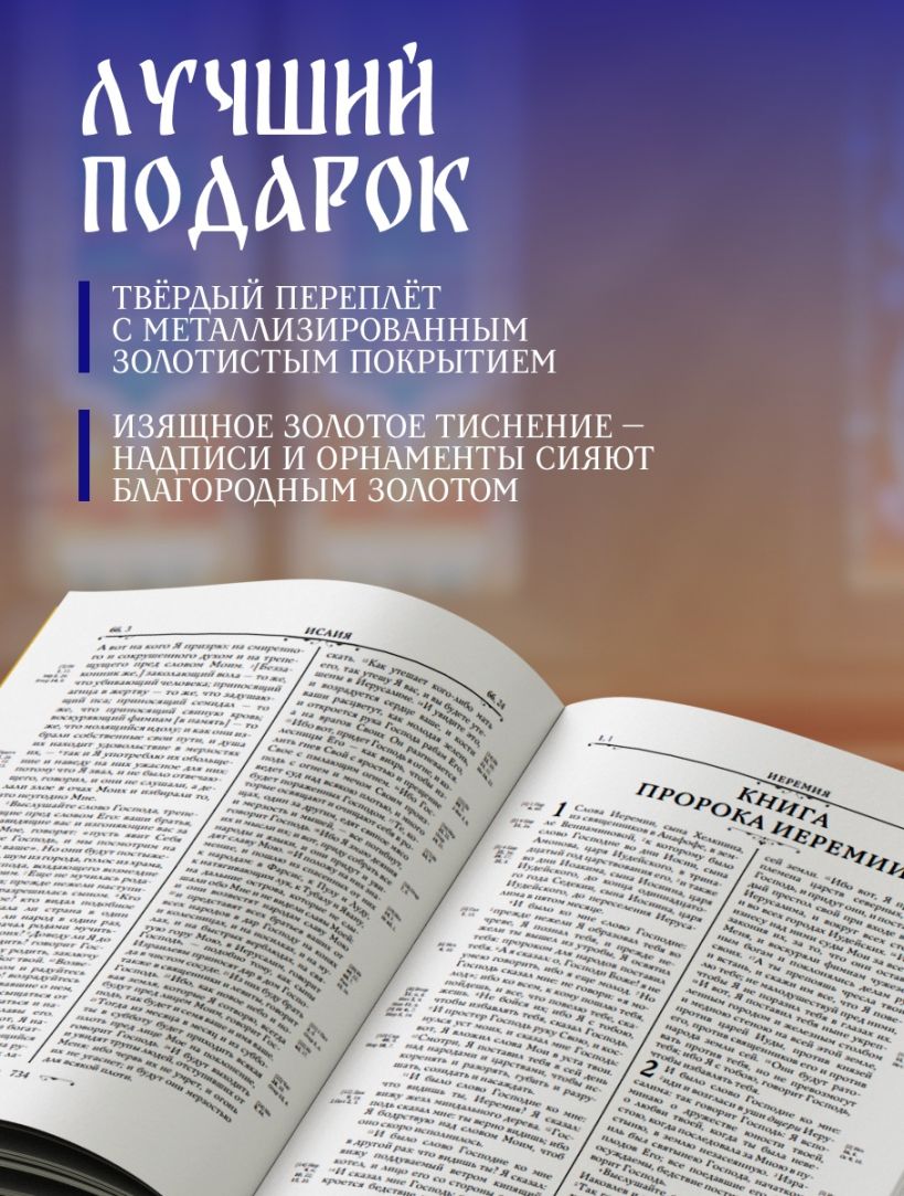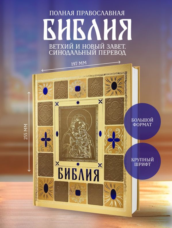 Полная Библия в русском Синодальном переводе. 50 книг Ветхого Завета и 27 книг Нового Завета. С указателем евангельских и апостольских церковных чтений, последовательностью евангельских событий по четырем евангелистам, последовательностью событий по книге Деяний святых апостолов, картами и другими приложениями. Перевод имеет высокий авторитет и широко используется не только в православной Церкви, но и в других христианских конфессиях, использующих русский язык для проповеди. Эксклюзивное оформление в золоте.
