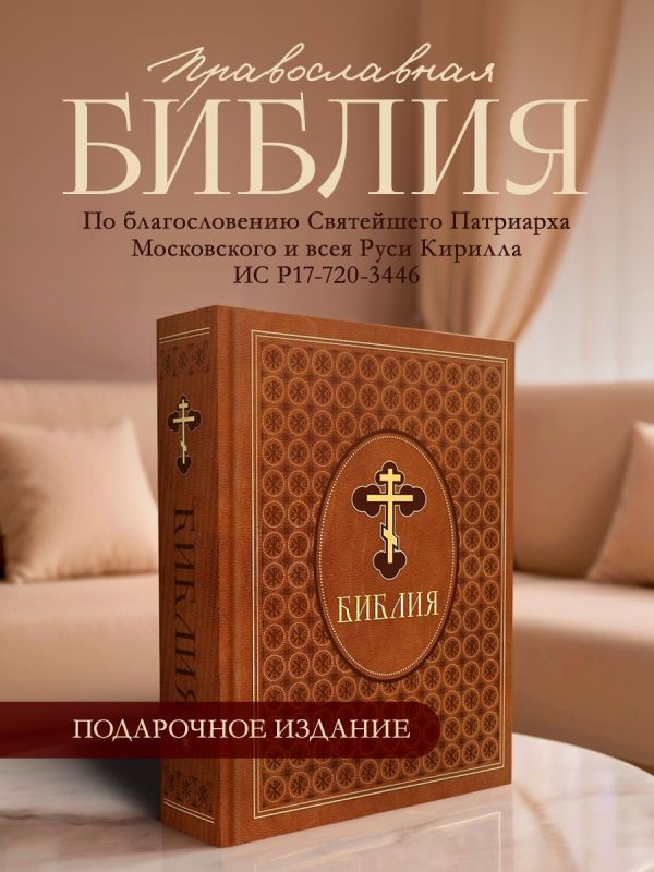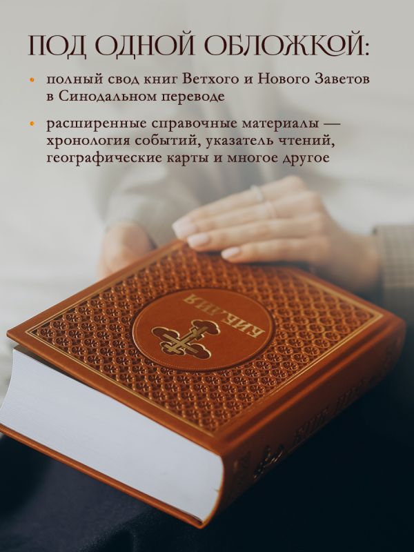 Полная Библия в русском Синодальном переводе. 50 книг Ветхого Завета и 27 книг Нового Завета. С указателем евангельских и апостольских церковных чтений, последовательностью евангельских событий по четырем евангелистам, последовательностью событий по книге Деяний святых апостолов, картами и другими приложениями. Перевод имеет высокий авторитет и широко используется не только в православной Церкви, но и в других христианских конфессиях, использующих русский язык для проповеди. Эксклюзивное оформление в экокоже.
