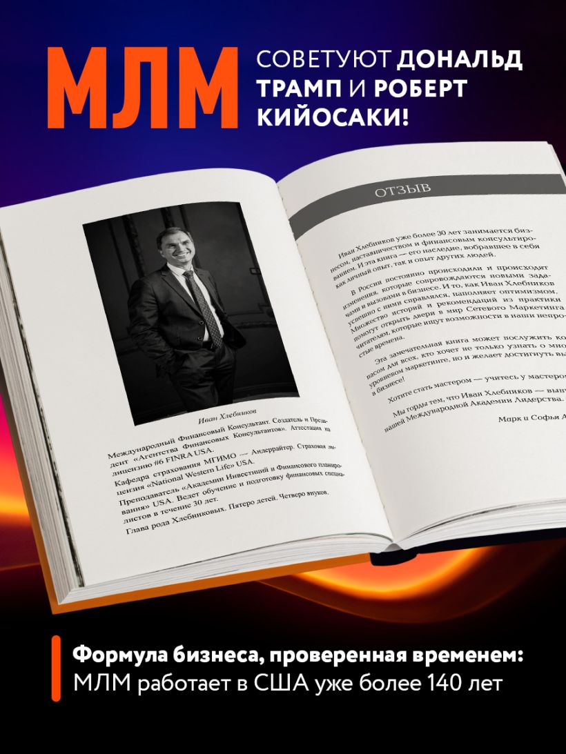 «Создавая эту книгу, Иван Хлебников поставил перед собой сверхцель — оставить наследие. Те перемены, которые происходили и происходят в России, ставят перед бизнесменами новые задачи и вызовы. Но пример автора наполняет оптимизмом при чтении его искреннего послания читателям, которые ищут новые возможности в наши непростые времена. Основанная на личном опыте и опыте многих людей, книга Ивана Хлебникова открывает перед читателем двери Сетевого Маркетинга.