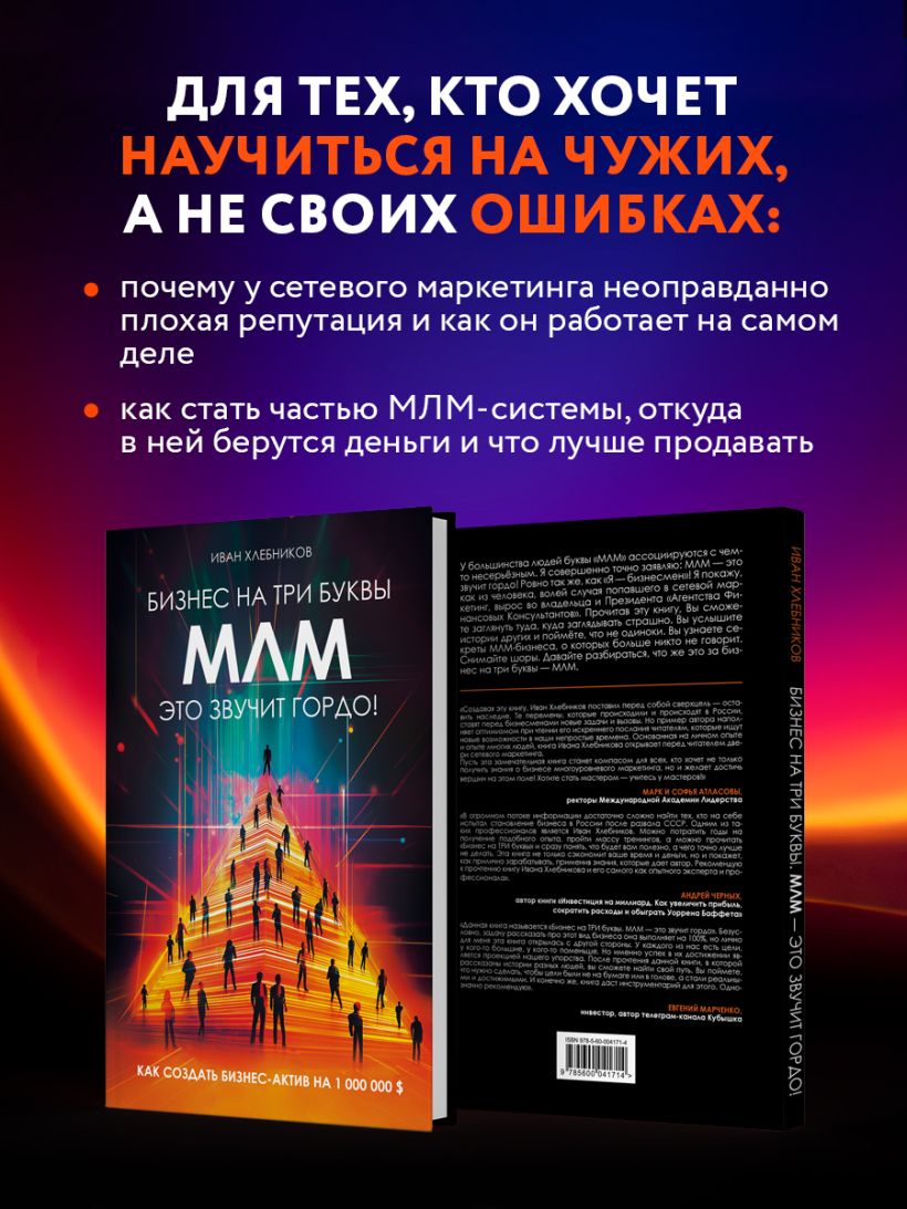 «Данная книга называется "Бизнес на ТРИ буквы. МЛМ — это звучит гордо". Безусловно, задачу рассказать про этот вид бизнеса она выполняет на 100%, но лично для меня эта книга открылась с другой стороны. У каждого из нас есть цели, у кого-то большие, у кого-то поменьше. Но именно успех в их достижении является проекцией нашего упорства. После прочтения данной книги, в которой рассказаны истории разных людей, вы сможете найти свой путь. Вы поймете, что нужно сделать, чтобы цели были не на бумаге или в голове, а стали реальными и достижимыми. И, конечно же, книга даст инструментарий для этого. Однозначно рекомендую». — Евгений Марченко, инвестор, автор телеграм-канала «Кубышка»