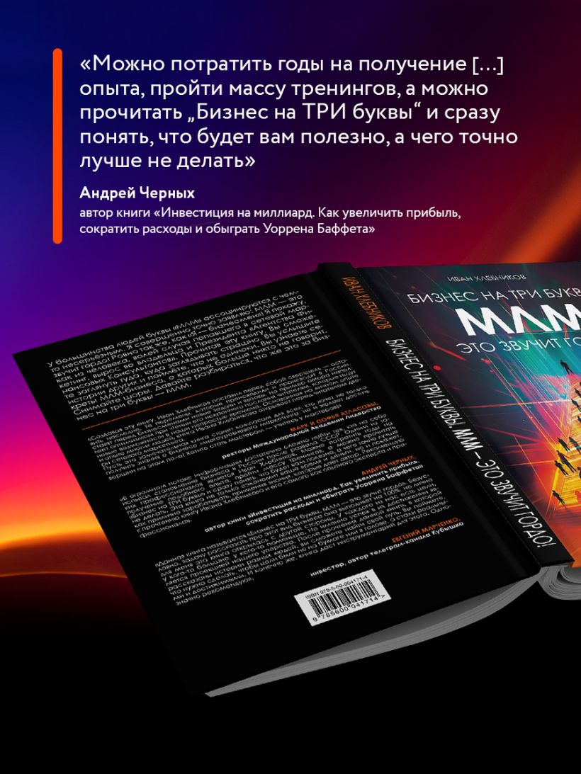 «В огромном потоке информации достаточно сложно найти тех, кто на себе испытал становление бизнеса в России после развала СССР. Одним из таких профессионалов является Иван Хлебников. Можно потратить годы на получение подобного опыта, пройти массу тренингов, а можно прочитать "Бизнес на ТРИ буквы" и сразу понять, что будет вам полезно, а чего точно лучше не делать. Эта книга не только сэкономит ваше время и деньги, но и покажет, как прилично зарабатывать, применив знания, которые дает автор. Рекомендую к прочтению книгу Ивана Хлебникова и его самого как опытного эксперта и профессионала». — Андрей Черных, автор книги «Инвестиция на миллиард. Как увеличить прибыль, сократить расходы и обыграть Уоррена Баффета»