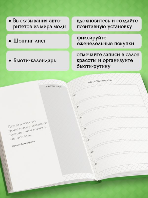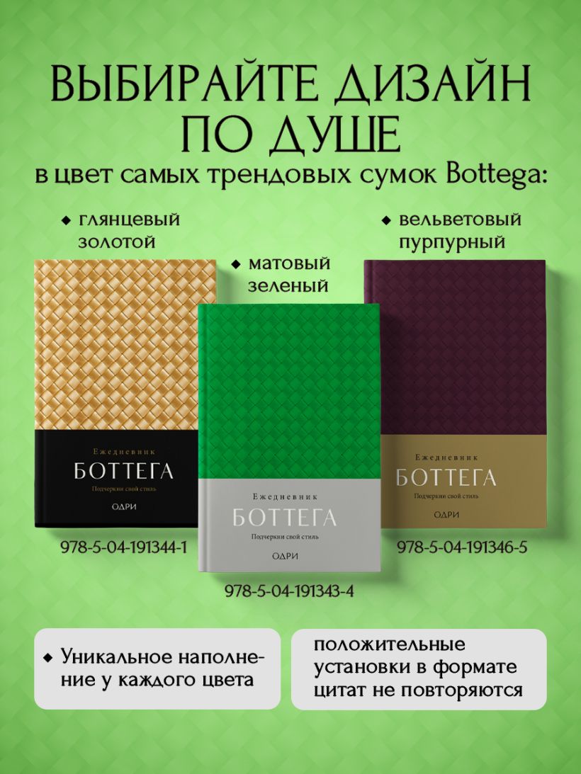 *Тактильная обложка с эффектом плетения, белая качественная бумага. Ежедневник представлен в трех оформлениях – самых актуальных цветах сумок: глянцевый золотой, вельветовый пурпурный, матовый зеленый. Каждый дизайн содержит индивидуальное наполнение – положительные установки в формате цитат не повторяются.