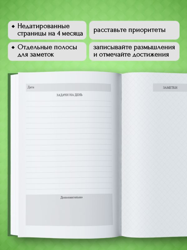 Недатированные страницы рассчитаны на 4 месяца. Благодаря им вы можете фиксировать свои приоритетные задачи и дополнительные, не требующие срочного решения.