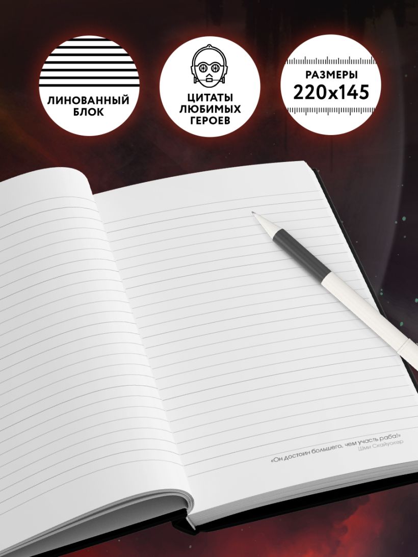 Официальные продукты одной из самых выдающихся кинематографических вселенных — Звёздные войны! Блокнот с цитатами любимых персонажей на каждом развороте. Любимая франшиза стала еще ближе!