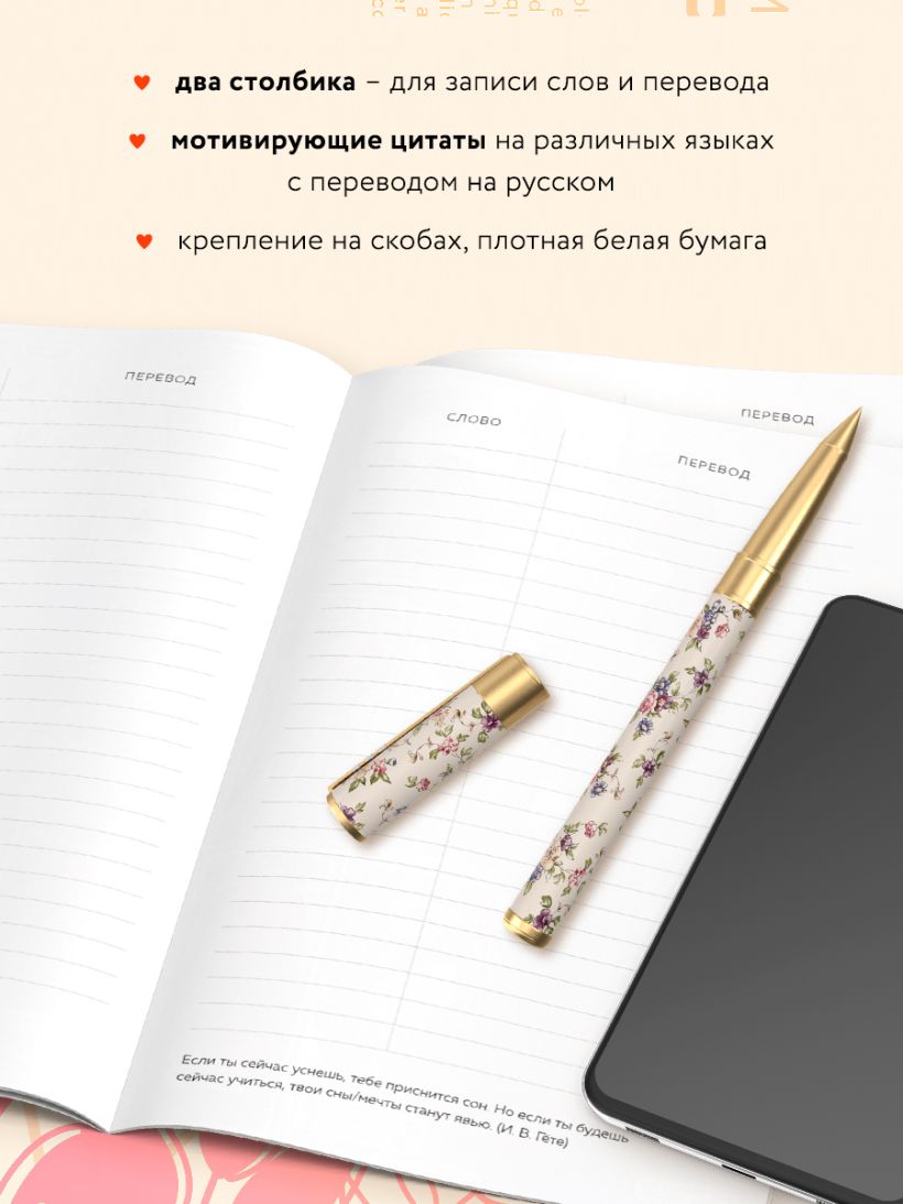 Большой словарный запас — ключ к общению на иностранном языке. Стильный и удобный блокнот создан для тех, кто стремится к совершенству. С помощью удобной структуры — два столбика для записи слов и перевода — вы сможете легко выучить новую лексику, нужно только закрыть рукой половину листа. Скругленные уголки надолго сохранят обложку в целости, а белая качественная бумага внутри будет радовать глаз. В блокноте вы также найдете мотивирующие фразы на разных языках, они помогут расширить кругозор и поставить новые цели.