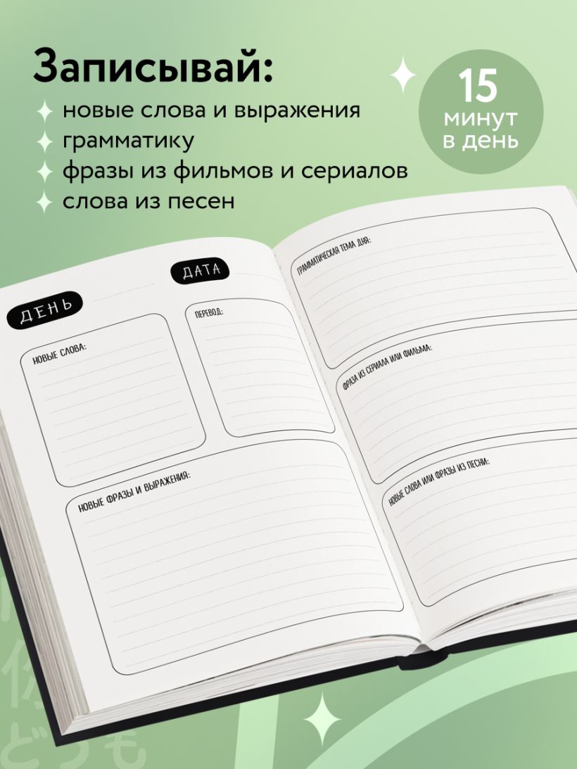 Следуйте инструкциям в блокноте, используйте трекер для наблюдений за прогрессом, старайтесь регулярно записывать новые слова и фразы из песен и фильмов. Заполнение каждого дня займет всего 15 минут! И не забывайте про систему поощрений. Удобный формат, плотная белая бумага и стильное оформление сделают обучение приятным.