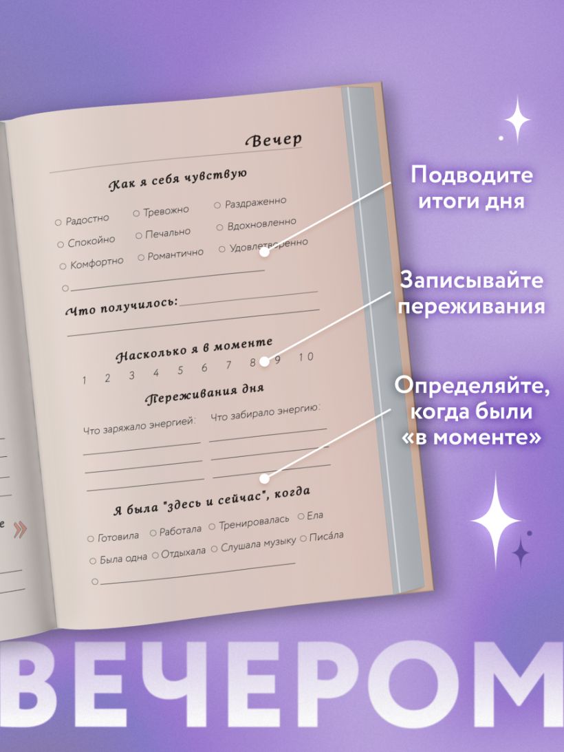 В нашем плотном ежедневном графике легко потерять фокус на настоящем моменте и на том, что для нас действительно важно. В этом блокноте найдется место для записи ваших мыслей и чувств. Ежедневная запись позволит отслеживать ваше состояние в динамике и видеть, какие события и сферы жизни как влияют на ваше здоровье и эмоциональное состояние — и регулировать присутствие тех или иных вещей в своей жизни, постепенно восполнять ресурс своей энергии и поддерживать его на высоком уровне.