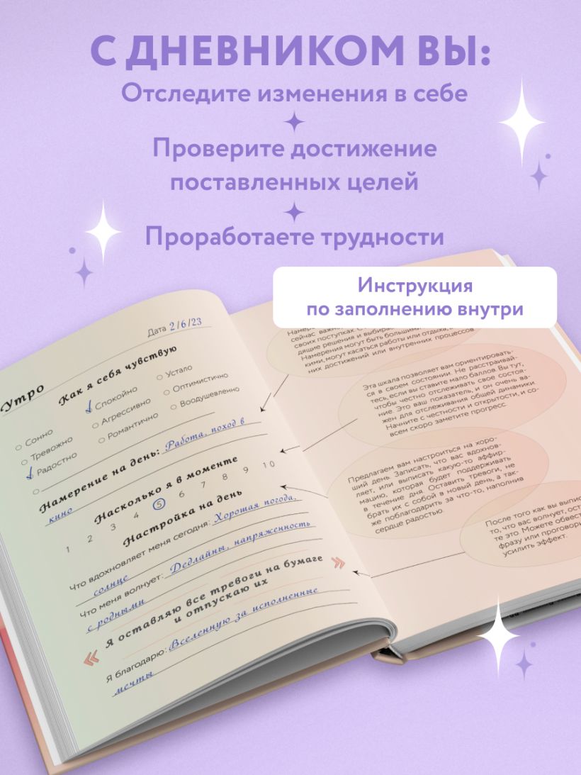 • Внутри бережная инструкция, чтобы заполнение блокнота приносило только приятные эмоции!
