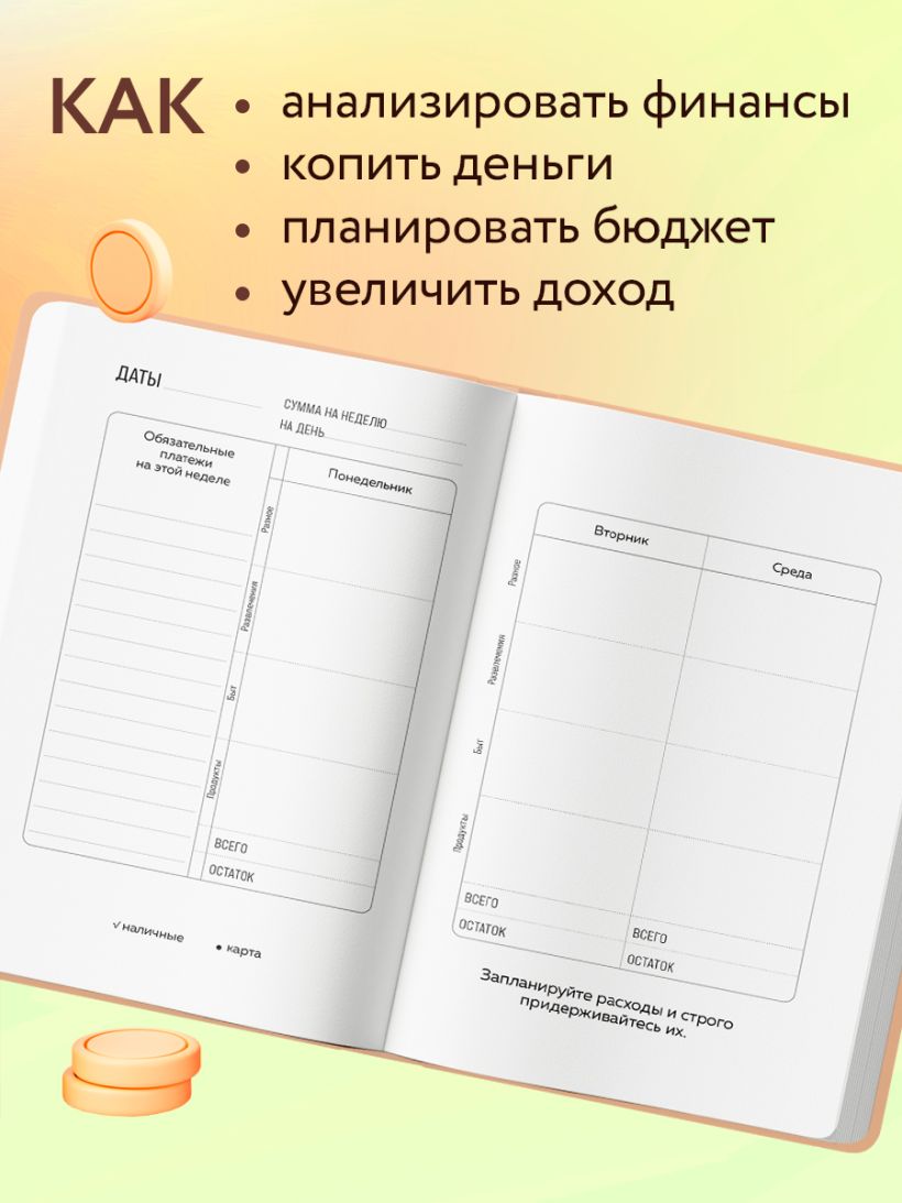 Научитесь планировать свой бюджет и откладывайте деньги на исполнение своих желаний! С нашим ежедневником вы сможете проанализировать свои финансы, научитесь копить деньги и сможете увеличить свой доход! Функциональная сетка расходов, в которой вы сможете записывать и анализировать свои траты по различным категориям, планировать бюджет на будущий месяц и подводить итоги. Ведите учет расходов и доходов и наблюдайте за своими успехами! С помощью удобного и простого графика вы поставите финансовые планы и цели на год, а полезный трекер и подсказки помогут вам достичь всех целей и накопить деньги.