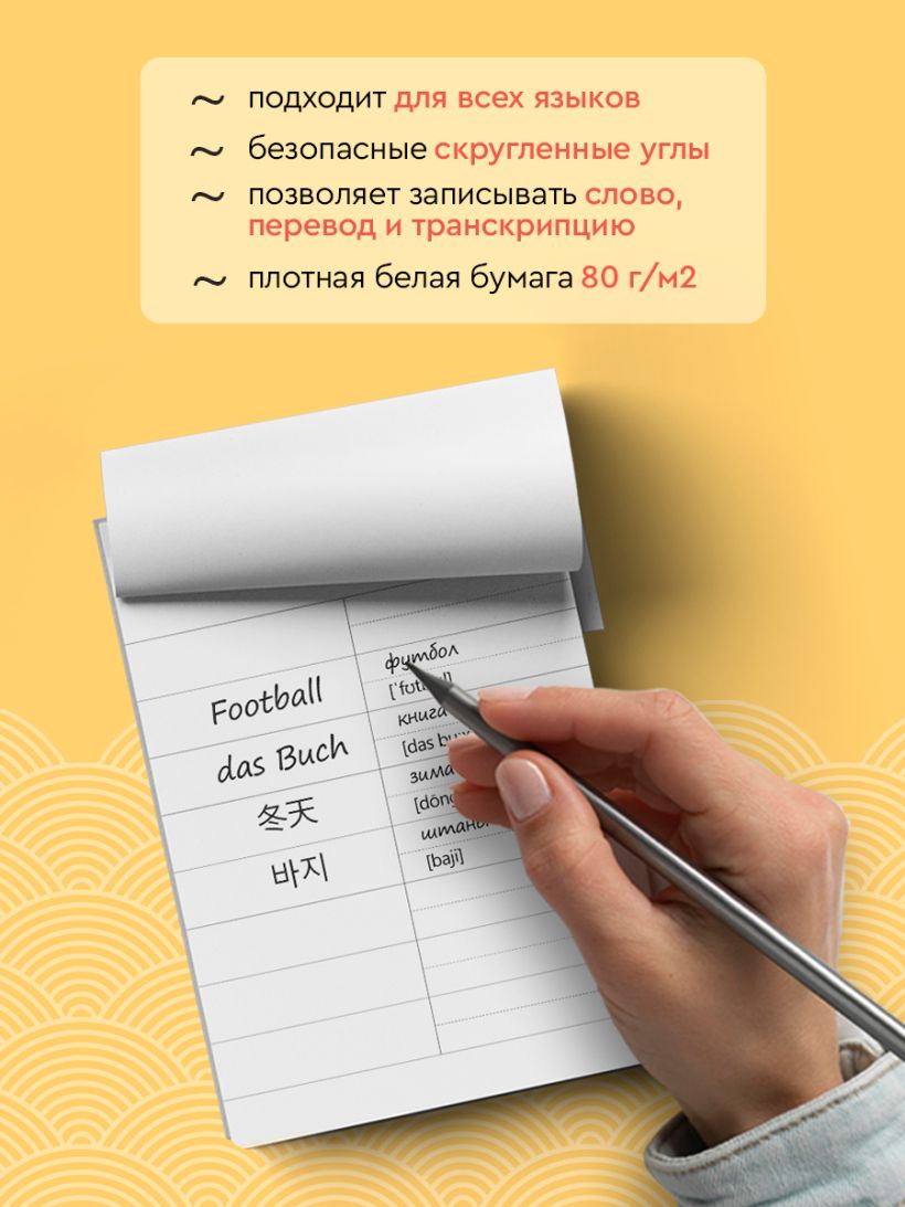Удобная линовка блока позволяет записывать слово на иностранном, его перевод и транскрипцию.