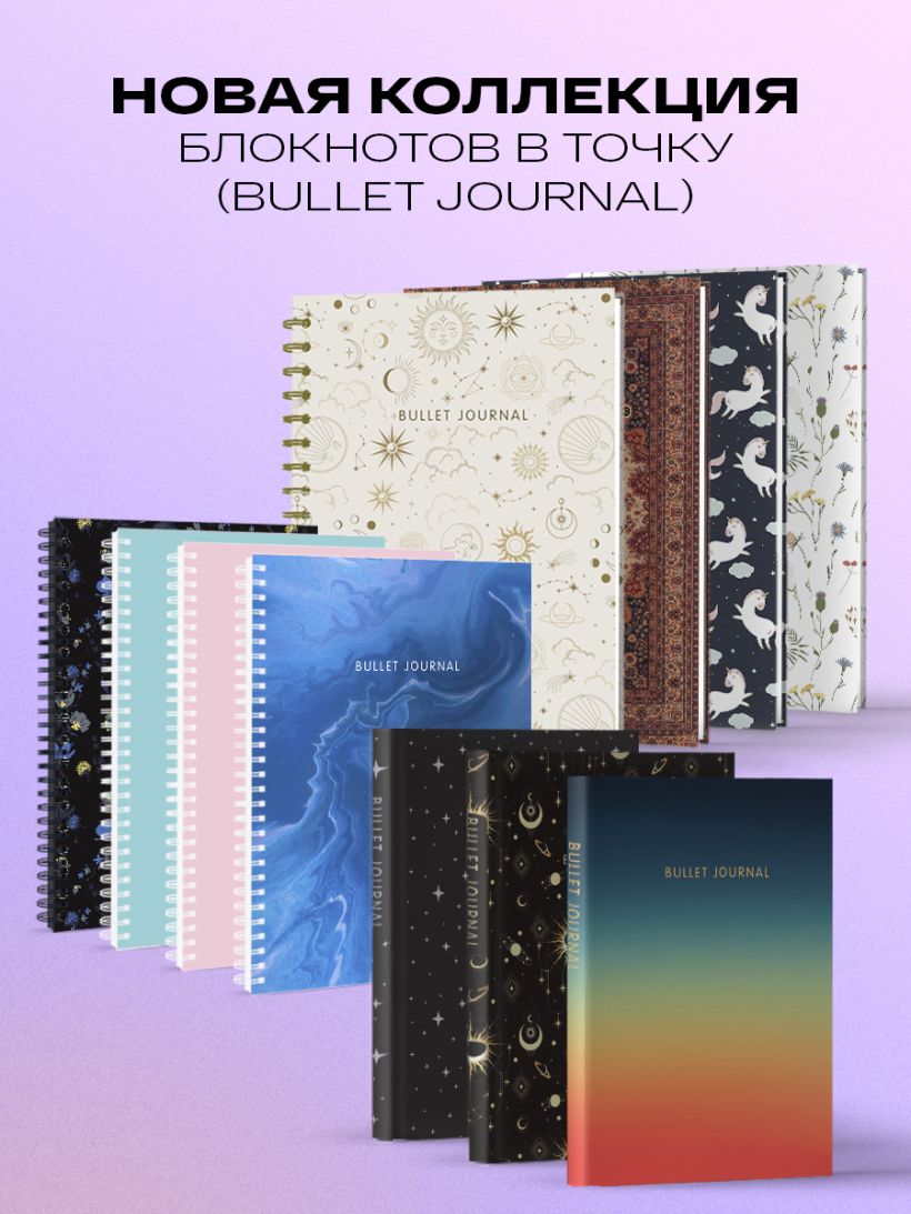Обновленная линейка популярных блокнотов в точку — Bullet Journal. Твердый переплет, серебряное глянцевое тиснение и яркие наклейки внутри! Для ведения своего Bullet Journal вы можете использовать множество инструментов: - Индекс — это оглавление, «навигатор» вашего ежедневника. Пронумеруйте страницы, чтобы вам было легко и удобно искать другие записи в блокноте. - Задачи — текущие дела, которые удобнее всего обозначать чек-боксами. - Заметки — идеи и мысли, их принято обозначать жирными точками. - События — встречи и мероприятия, для обозначения которых можно использовать пустые круги. - Примечания — это пометки на полях («Приоритет», «Изучить», «Идея» — вы можете использовать любые удобные для вас пиктограммы). - Ежемесячный календарь с вашими планами на ближайший месяц. - Планы на день. - Тематические списки (например, «Список для чтения», «Фильмы на просмотр», «Обязательно посетить...» и т.д.). - Майнд-карты для достижения ваших целей. Настройте ваш Bullet Journal под себя! Больше никаких правил и строгих рамок. Планирование может и должно приносить удовольствие!