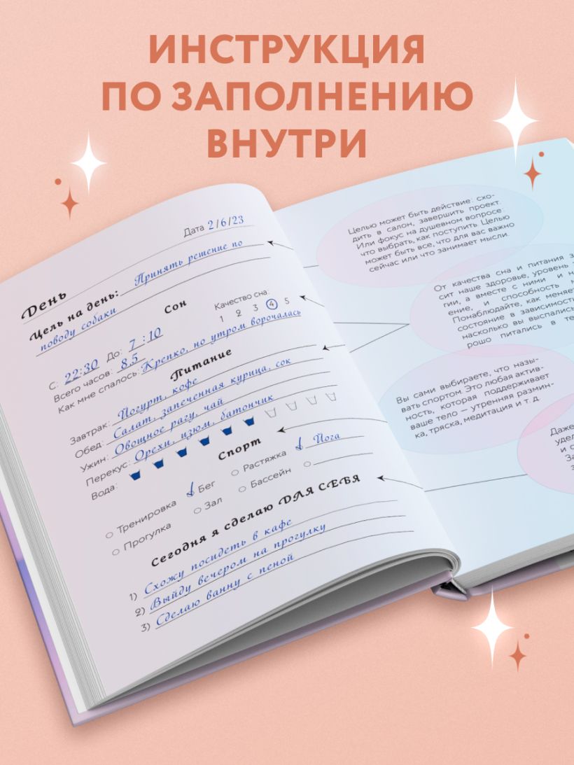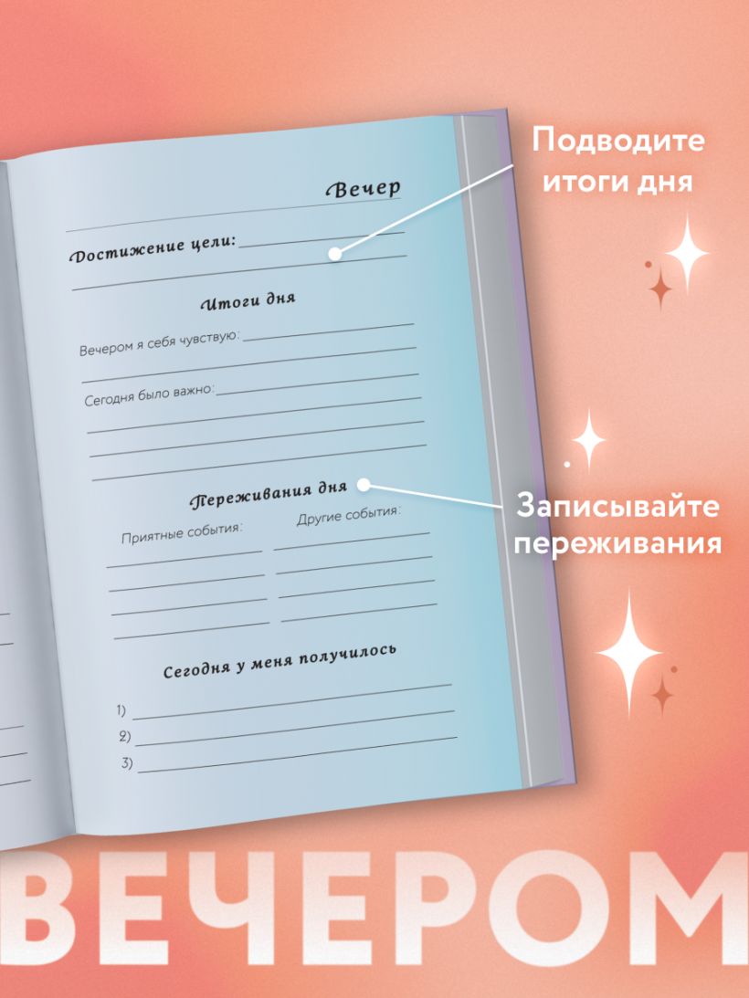 В нашем плотном ежедневном графике легко потерять фокус на настоящем моменте и на том, что для нас действительно важно. В этом блокноте найдется место для записи ваших мыслей и чувств, активностей и отдыха. Ежедневная запись позволит отслеживать ваше состояние в динамике и видеть, какие события и сферы жизнь как влияют на ваше здоровье и эмоциональное состояние — и регулировать присутствие тех или иных вещей в своей жизни, постепенно восполнять ресурс своей энергии и поддерживать его на высоком уровне.