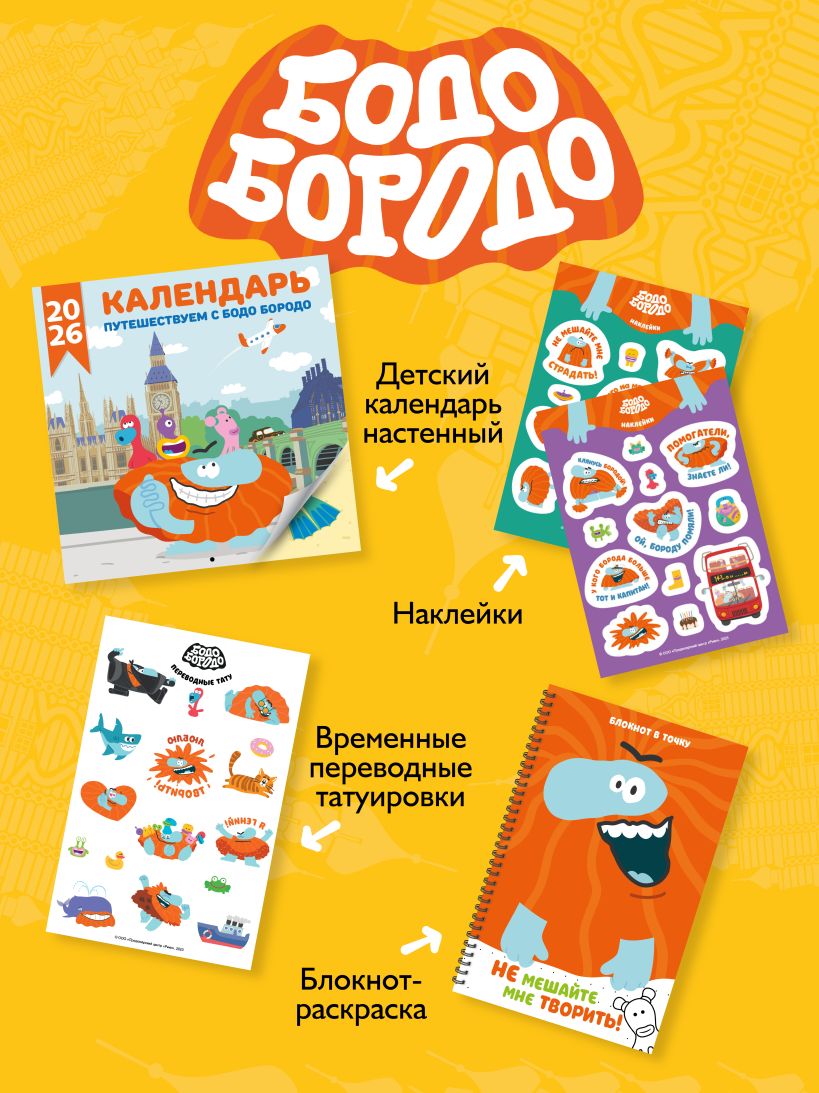 Бодо Бородо — лучший учитель в мире. Правда, только по его собственному мнению. Он не знает ничего, но сможет научить детей всему. Специально для этого он стал наклейками, чтобы вместе с вашим ребенком изучить азы дизайна. Дети вместе с Бодо будут украшать свои комнаты, тетради, блокноты, телефоны или даже бутылки для воды. В наборе 2 листа с наклейками (всего 24 штуки). Размер А5 (148х210 мм). Наклейки не помнутся при доставке — мы положили в упаковку плотную картонку. Стикерпак изготовлен из качественных материалов, благодаря чему наклейки долго не выцветут. Самоклеящаяся пленка не рвется, а наклейки легко отделяются от фона. Отличный подарок для ваших детей на день рождения или Новый год! Соберите всю коллекцию с Бодо Бородо: - «Бодо Бородо. Блокнот-раскраска (А6, 96 стр. в точку, на пружине)» - «Бодо Бородо. Наклейки (24 наклейки на 2 листах)» - «Бодо Бородо. Временные переводные татуировки» - «Бодо Бородо. 3D-стикеры на телефон» - «Детский календарь настенный на 2026 год. Бодо Бородо (290х290 мм)»