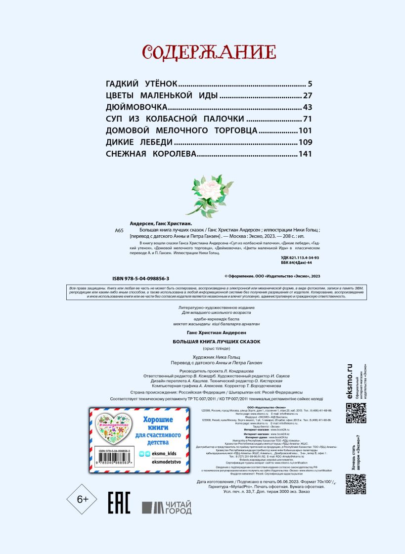 Знаменитый датский сказочник Ганс Христиан Андерсен написал столько сказок! Самые лучшие и известные из них вошли в эту книгу. На её страницах поселились любимые детьми персонажи: Снежная Королева, Кай и Герда, дикие лебеди и добрый домовой, гадкий утёнок, ставший прекрасным лебедем, и цветы маленькой Иды. И, конечно же, вы узнаете из первых уст рецепт супа из колбасной палочки. В состав сборника вошли семь сказок: «Гадкий утенок», «Цветы маленькой Иды», «Дюймовочка», «Суп из колбасной палочки», «Домовой мелочного торговца», «Дикие лебеди» и «Снежная королева».