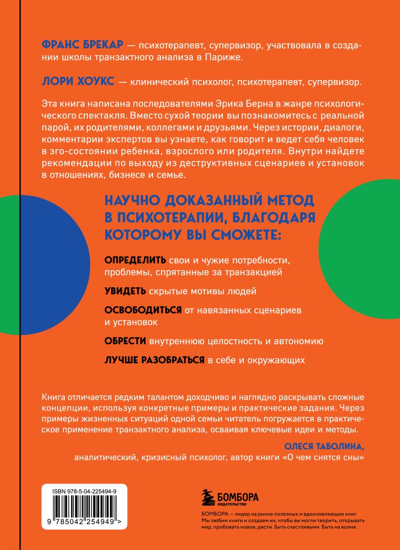 Эта книга написана последователями Эрика Берна в жанре психологического спектакля. Вместо сухой теории вы познакомитесь с реальной парой, их родителями, коллегами и друзьями. Через истории, диалоги, комментарии экспертов вы узнаете, как говорит и ведет себя человек в эго-состоянии ребенка, взрослого или родителя. Внутри найдете рекомендации по выходу из деструктивных сценариев и установок в отношениях, в бизнесе и в семье.