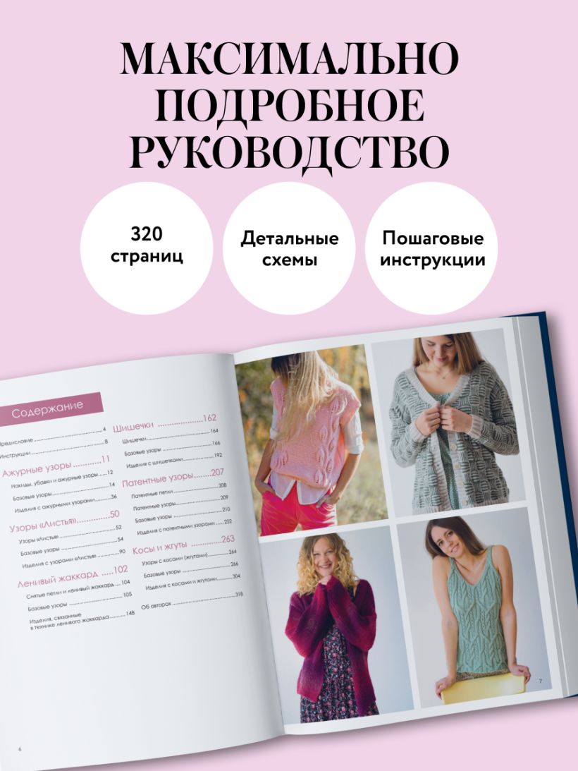 На 320 страницах собрано всё для современной вязальщицы: подробные инструкции к базовым петлям, обзоры техник и материалов. Шесть четко структурированных категорий узоров подходят для любого уровня мастерства. 18 подробных проектов с пошаговыми инструкциями помогут сразу воплотить идеи в жизнь.