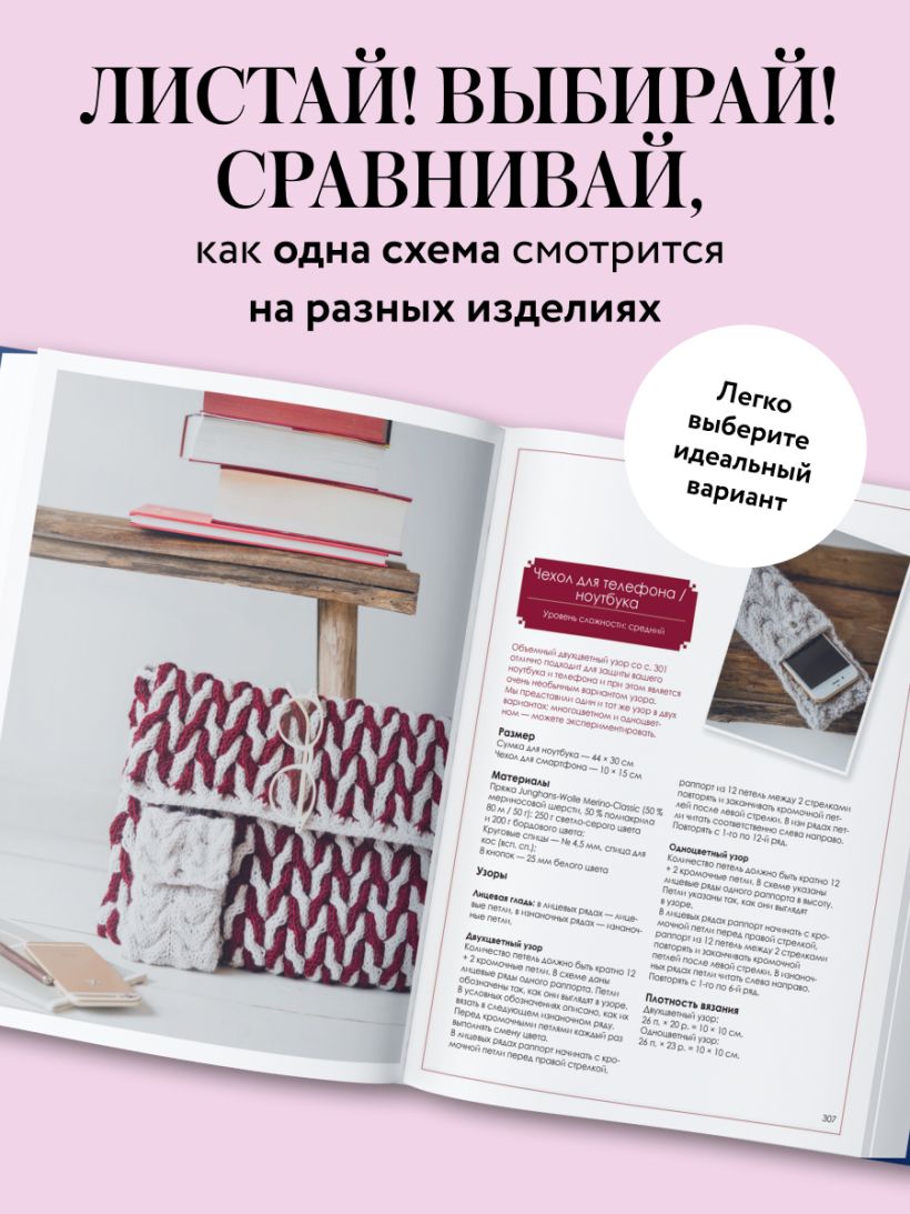 Открыв книгу на любом узоре — например, «Ажурные листья» — вы сразу увидите, как он может выглядеть в разных изделиях. Этот узор может превратиться в изящное болеро, летние носочки, элегантную салфетку или пятнадцать других совершенно разных вещей. И так с каждым из 99 узоров!