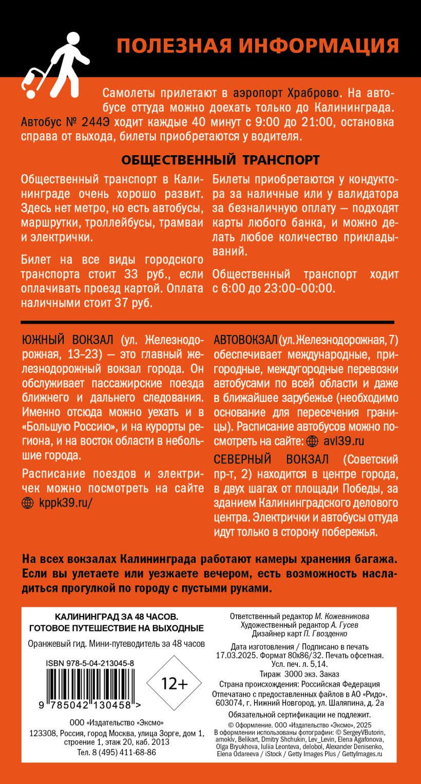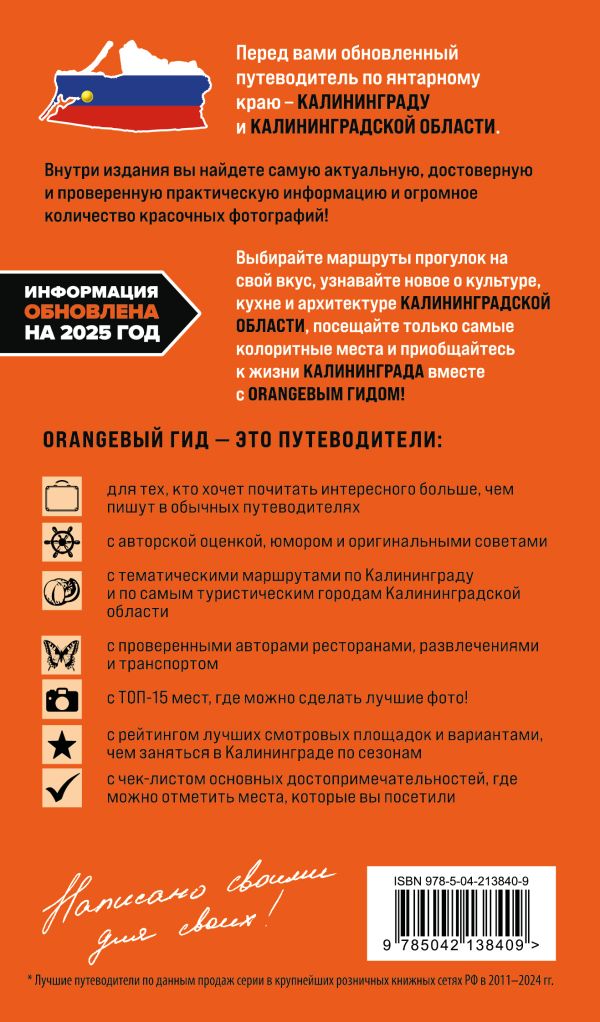 Оранжевый гид предлагает вам самостоятельно исследовать Калининград и его окресности. На страницах путеводителя вы найдете только актуальную информацию - интересные музеи, самые лучшие рестораны и бары, увлекательные маршруты. Осталось только выбрать на свой вкус! Прогуляйтесь по средневековым рыцарским замкам, романтичным улочкам и немецким кирхам и почувствуйте атмосферу Европы, не уезжая за границу!