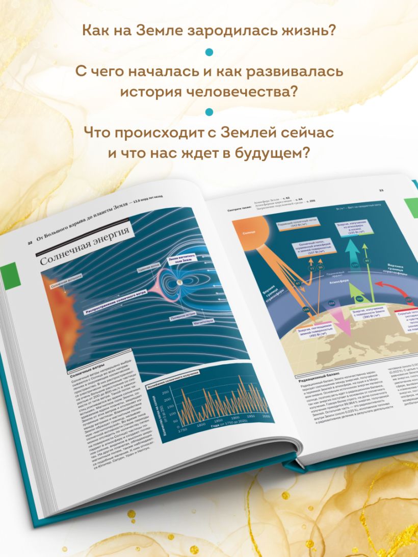 Каждая из 9 глав атласа охватывает ключевые этапы развития планеты — от Большого взрыва до современности, от зарождения жизни до эпохи глобализации и изменения климата.