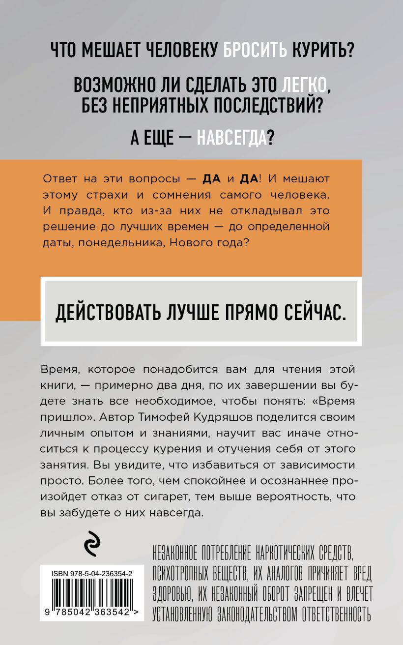 Однако действовать надо решительно и прямо сейчас. Время, которое понадобится вам для чтения этой книги, — примерно два дня, и по их завершении вы будете знать все необходимое, чтобы понять: "Время пришло". Автор Тимофей Кудряшов и поделится своим личным опытом и знаниями, и научит вас иначе относиться к процессу курения и отучения себя от этого занятия. В итоге вы увидите, что бросить легко возможно, более того, чем спокойнее и мягче произойдет отказ от сигарет, тем выше вероятность, что вы забудете о них навсегда.