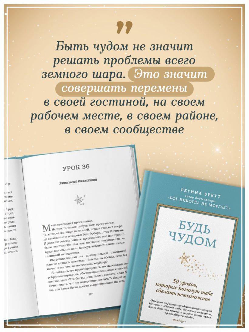 Вторая книга Регины Бретт — это целая сокровищница вдохновляющих историй. Их герои — обычные люди, достойные восхищения. Каждый рассказ несет свой урок. А вместе они составляют своего рода учебник, дающий стимул творить добро и видеть чудо перемен повсюду.