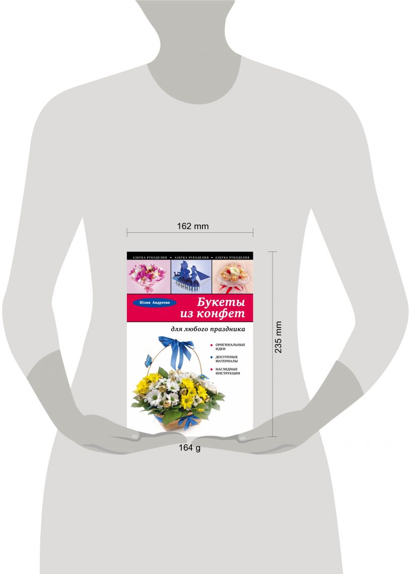 Букет из конфет - красивый и оригинальный подарок, который будет уместен на любом празднике. С помощью этой книги вы своими руками изготовите запоминающийся сладкий презент, потратив совсем немного сил и времени. Книга содержит иллюстрированные мастер-классы по созданию 9 оригинальных моделей букетов из конфет, подробное описание необходимых материалов и инструментов, понятные инструкции и важные практические советы. С помощью этой книги вы легко освоите искусство изготовления букетов и композиций из конфет. У вас больше никогда не будет проблем с подарками! Приятного творчества!
