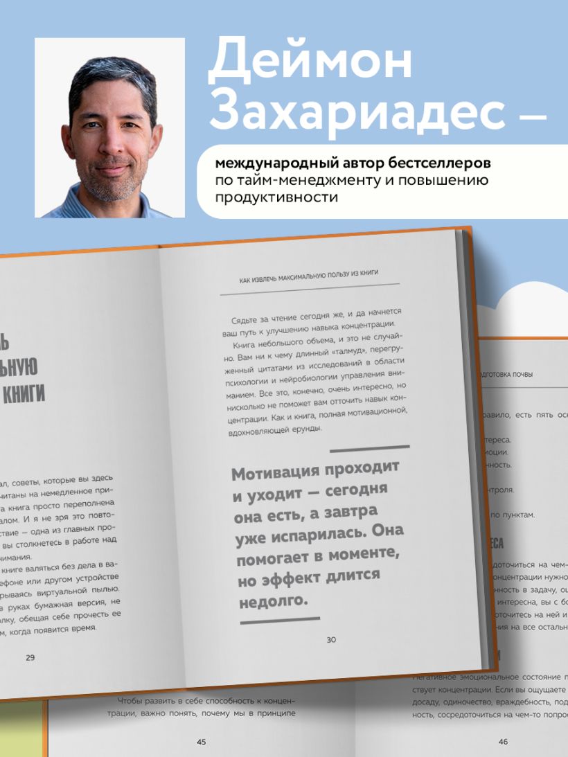 Деймон Захариадес — человек, совершивший добровольный побег из корпоративной действительности. Он годами терпел бесполезные совещания, светские беседы с коллегами и прочие отвлекающие факторы, — пока не вырвался на свободу. Сегодня он не только автор бестселлеров по тайм-менеджменту и повышению продуктивности, но и ведущий блога по продуктивности ArtofProductivity.com. В свободное время он демонстрирует свои копирайтерские способности, создавая контент-маркетинговые кампании, которые используются современными молодыми предприятиями для привлечения клиентов. Дэймон живет в Южной Калифорнии со своей прекрасной и всегда готовой поддержать его женой и их игривой собакой Рокки.