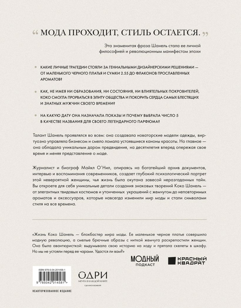 Эта книга — не просто биография, а глубокий психологический портрет женщины, которая превратила свою жизнь в легенду и сделала моду и стиль формой высказывания. Перед вами — история о таланте и невероятной силе характера. На основе архивов, писем и редких интервью автор книги Майкл О’Нил воссоздает живой образ великой Мадемуазель — дерзкой, независимой, непредсказуемой. Вы откройте для себя уникальные детали создания знаковых творений Коко Шанель — от элегантных твидовых костюмов и утонченных украшений с жемчугом до неповторимых ароматов и аксессуаров, которые навсегда изменили мир моды и стали символами стиля на все времена.